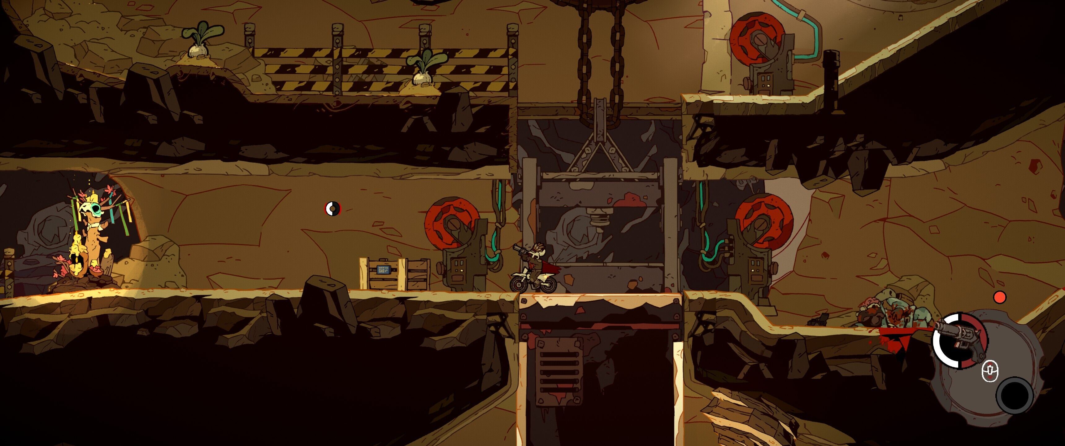 Sí, divisas, porque en Laika no estamos siempre sobre la moto. Hay lugares donde aparcar nuestra montura. A veces son pueblos, otras, pequeñas localizaciones como un hostal sobre ruedas, y en la mayoría de las ocasiones, sitios donde descansan personajes bajo el sol que nos venden objetos o mapas. Tantos en unos como en otros podemos obtener misiones, algunas más directas y otras que se alargan con varios pasos, unas que nos piden encontrar a un personaje en el yermo y otras que nos llevan a explorar una enorme zona subterránea. Se pueden abordar en el orden que queramos, e incluso hay algunas que aparecen de manera repentina al entrar a una zona, como nos ocurrió en una ocasión en la que terminamos luchando contra un jefe final espectacular; sí, también hay bosses en Laika, y aunque en diseño son geniales, les vendría bien un poco más de mala leche porque son más fáciles que el resto de la experiencia.