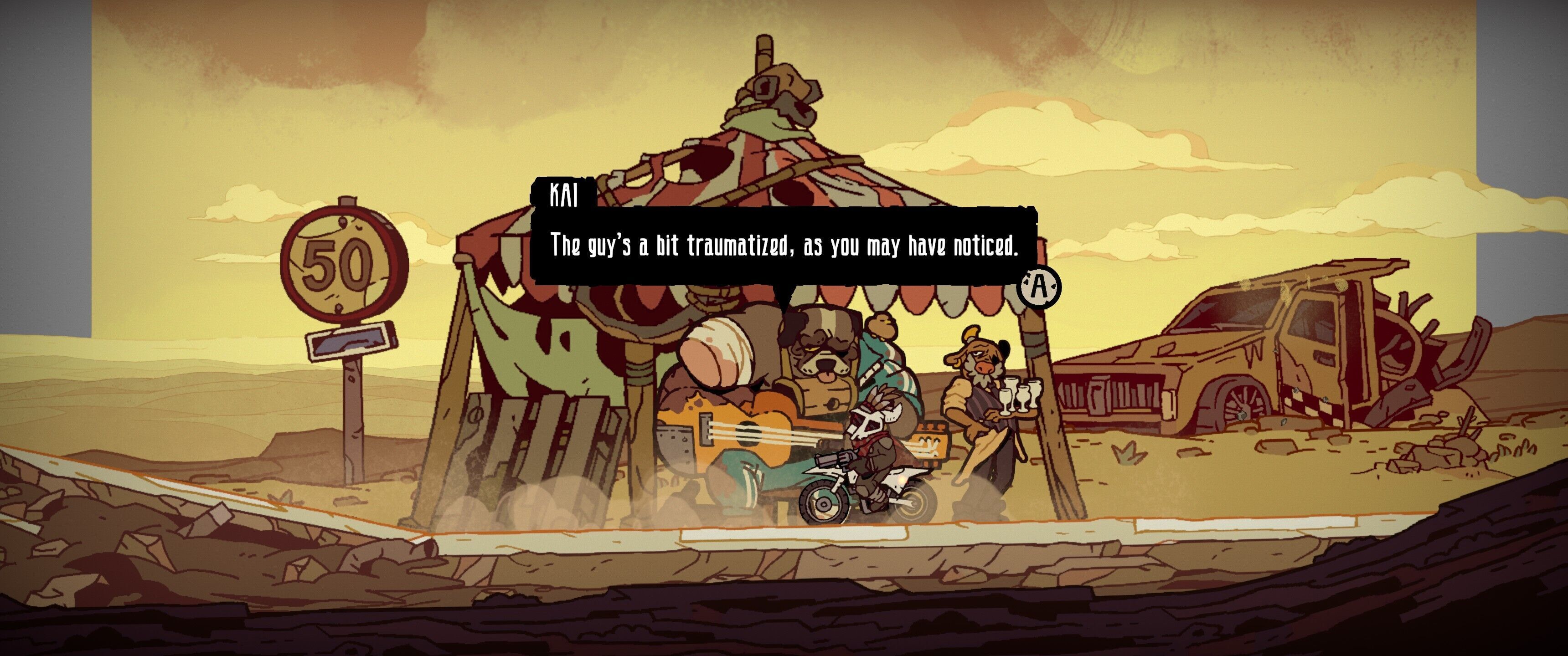 El mundo que ha construido Brainwash Gang es duro, áspero y emotivo. Un yermo postapocalíptico sumergido en una guerra sádica; la historia arranca con Laika teniendo que rescatar a un amigo de un búnker de los pájaros al que ha ido para dejar un reguero de sangre para vengar a su hijo, al que han ahorcado con sus propias tripas. Es descarnado, pero tiene corazón. La rudeza de la protagonista ante todos excepto con su hija se entiende al ver el mundo que la rodea, y con un flashback jugable que nos dejó un rato parados en la silla. Los diálogos, en inglés, están fantásticamente escritos, y hay hueco para el humor, ácido casi siempre, entrañable otras. Es, también, un universo tribal, con unas costumbres antiguas que se combinan con la tecnología analógica. Y los nombres de los lugares. "Where We Sleep" (nuestro hogar), "Where Our Bikes Growls" (la zona que rodea la aldea), "Where Our Ancestors Rest". El bar, "Where We Forget". Precioso.