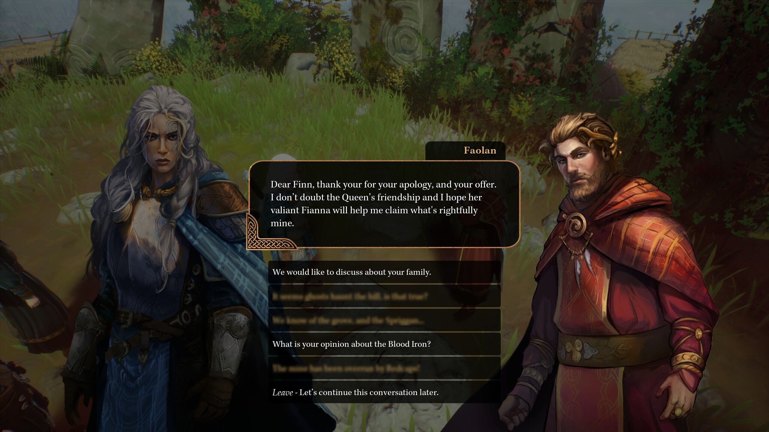 Finn lidera a la Fianna, un grupo de Campeones apadrinados por la regente del reino, quien los envía a resolver los distintos entuertos que suceden en él. Es un grupo variopinto: nuestro personaje, que en el juego completo no estará ligado a ninguna clase y por lo tanto se podrá desarrollar libremente con las habilidades y los atributos que prefiramos, está acompañado, en la demo, por un guerrero, una druida y una arquera, cada cuál con su personalidad. Por lo tanto, nuestras decisiones impactarán de manera diferente en cada uno de ellos. Además de conocer a otros compañeros, en el juego completo se podrán establecer romances con ellos, o todo lo contrario: nos abandonarán si repetidamente tomamos decisiones con las que no estén de acuerdo.