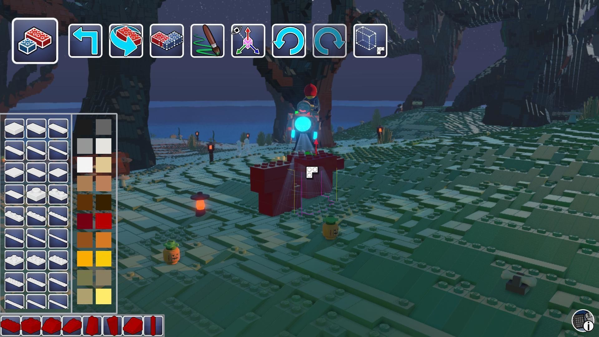 Además de la herramienta de construcción con ladrillos, tenemos un apartado de herramientas de edición del terreno, con las que podemos pintar los ladrillos de los escenarios del color que queramos, añadir grandes bloques, alisar o igualar, hacer rampas, hundir el terreno o levantarlo, o incluso copiar y pegar partes enteras de los escenarios. Las herramientas de edición son completísimas, y nos han sorprendido la verdad, esperábamos algo más simplificado, y tienen un potencial enorme para hacer lo que quieras con los mundos que nos proponen.