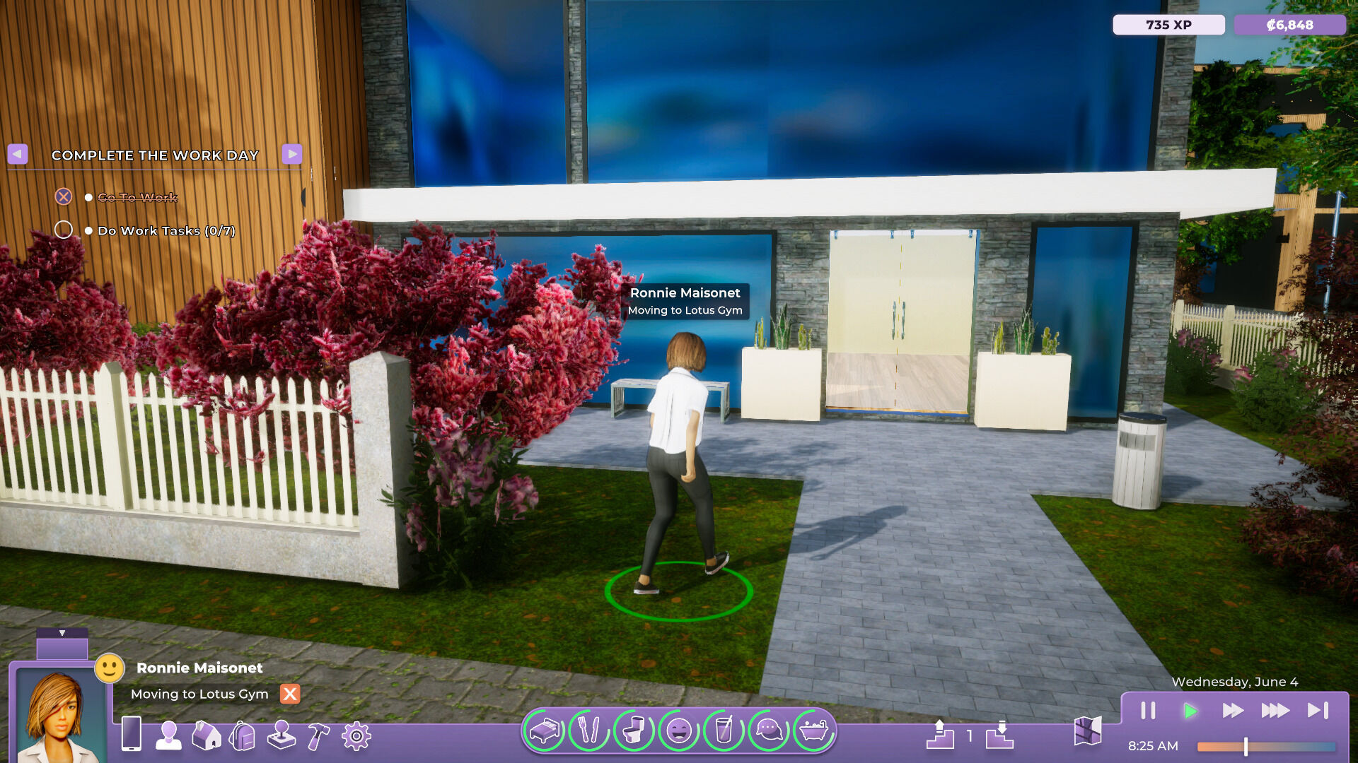 Trabaja en un gimnasio, y tras hacer sus necesidades básicas por la mañana (ir al aseo, vestirse, desayunar), acude al centro de entrenamiento que está en su mismo vecindario, nada más cruzar la calle. Cada empleo tiene una carrera: es entrenadora, pero con el tiempo, si hace bien su trabajo, completa las misiones diarias y no comete errores, podrá ascender: paulatinamente se le dan más actividades que realizar en los días laborables, y llegará un momento en el que se activará una actividad para subir en el escalafón. Y si no va todo como esperabas, siempre puedes cambiar de puesto y hasta de oficio.