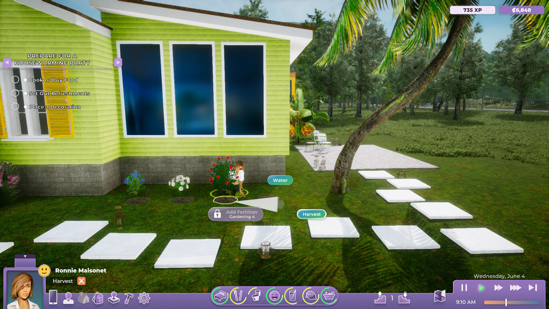 Hablábamos antes del realismo en cada acción, así que allá van varios ejemplos de ello. Al ducharte, la ropa que llevabas puesta queda en el suelo: si no la recoges, permanece ahí, y con el tiempo, olerá mal, lo que afectará a las estadísticas del hogar, que influyen en sus inquilinos y en los visitantes. Algo similar ocurre al comer: hay que recoger el plato de la mesa y lavarlo si no queremos que acabe formando moho. Hablando de comida: se pueden plantar y recolectar vegetales si tienes un patio, y utilizarlos en las recetas de cocina que hayamos descubierto. También se pueden plantar flores, que tienen su propio sistema de crafting que permite formar distintos ramos y composiciones florales.