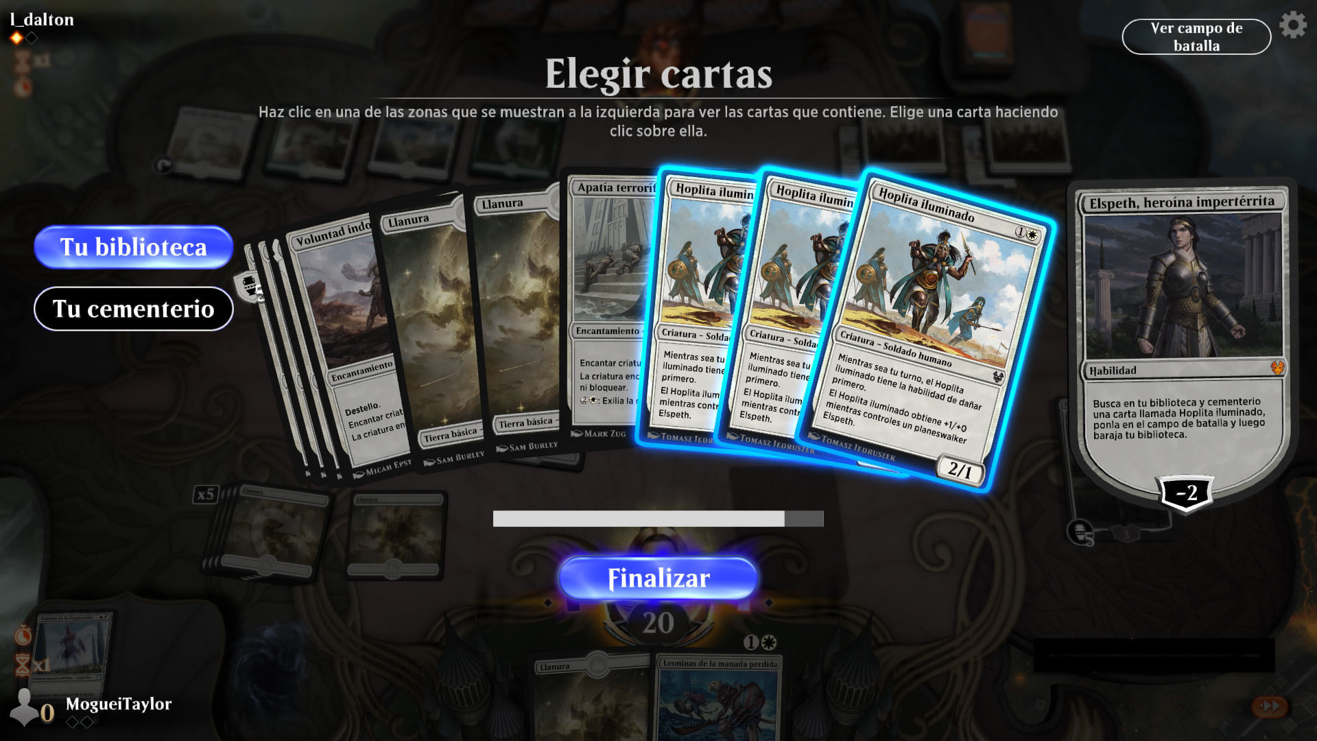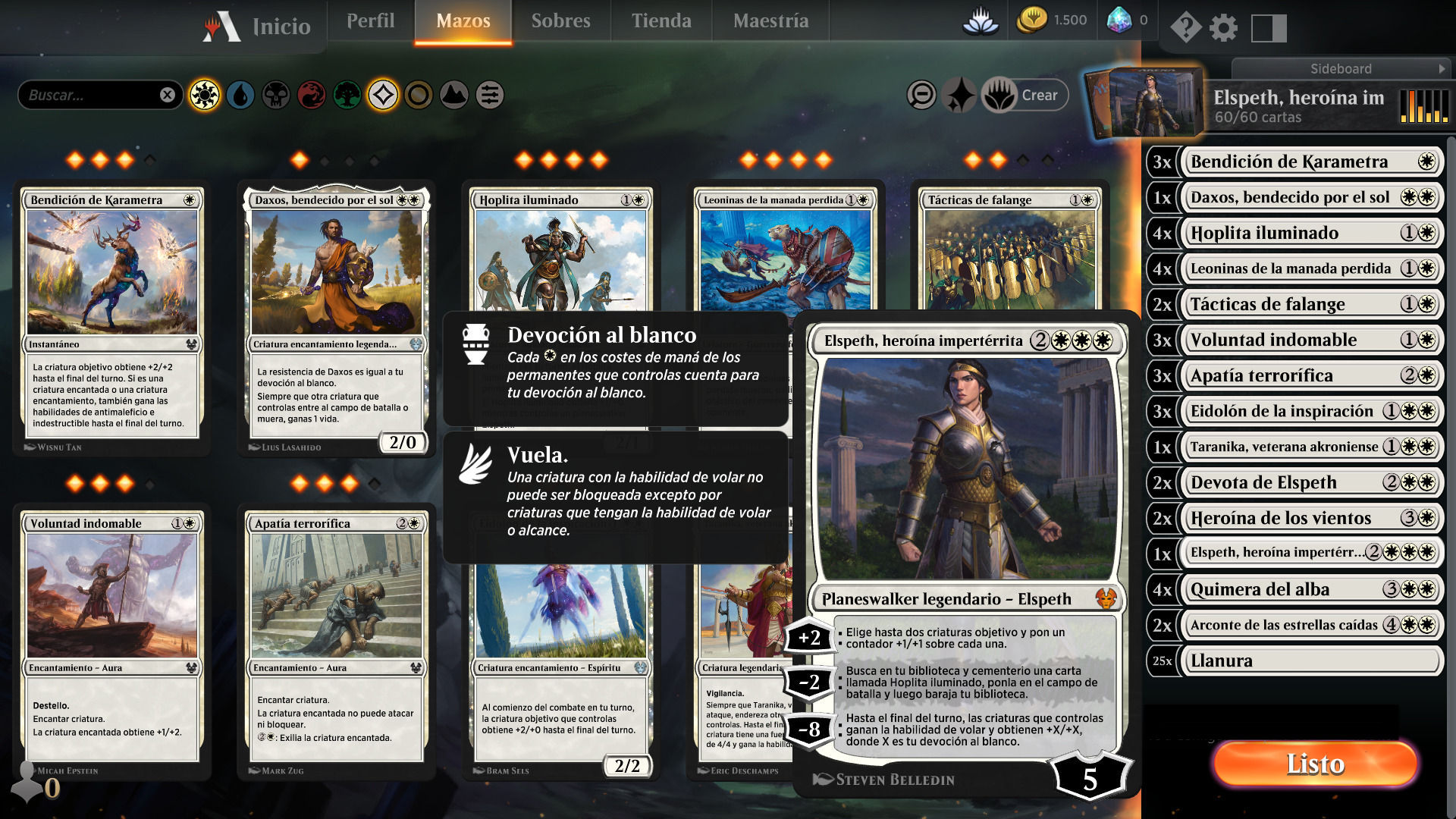 En muchos de nuestros encuentros durante los primeros días del set de cartas, hemos usado dos de los mazos preconstruidos que nos ha proporcionado Wizards, el de Ashiok, artista de temores y Elspeth, heroína impertérrita. Pese a que ya sabemos que este tipo de mazos no suelen ofrecer todo el potencial de una expansión de cartas, y no son especialmente recomendados para jugar en Estándar sin hacer algunas modificaciones, sirven como vehículo de entrada para todos aquellos jugadores que no han jugado a Magic: The Gathering en años o que quieren disfrutar de las novedades de la nueva ampliación. Ambos tienen mecánicas muy diferenciadas, que se pueden adaptar bien a todo tipo de usuarios. El mazo de Elspeth es lento, sí, pero es capaz de desplegar en pocos turnos un buen número de criaturas, soldados y cartas con habilidades que les permiten fortalecerse entre ellas, crear fichas o mantener vínculos especiales. Como planeswalker, Elspeth es especialmente útil, pues su habilidad definitiva como luchadora es capaz de dar la puntilla al rival si hemos tenido algo de suerte y unas manos acordes. La habilidad Dañar primero, los hechizos con Destello y la posibilidad de volar, son los ejes sobre los que giran este mazo de 60 cartas en el que el color blanco predomina sobre todo.