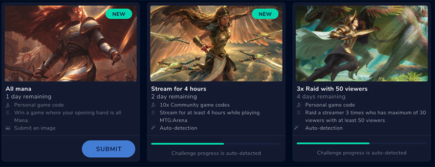 Ahora, en colaboración StreamElements, Magic: The Gathering ha anunciado una serie de retos directos que buscan estrechar los lazos con la comunidad, invitándolos a obtener recompensas durante todo ese proceso. El programa, anunciado como algo que está en constante evolución, busca ofrecer retos semanales como retransmisiones de 4 horas seguidas, destruir criaturas de una forma concreta o disfrutar de partidas en Arena con mazos preconstruidos o diseñados de una manera concreta. Divididos en retos automáticos y manuales, Wizards, StreamElements y Twitch han diseñado un nuevo programa que también repercutirá de forma directa en los espectadores, que podrán disfrutar de premios y recompensas especiales. A otro nivel, y centrada en la producción de series y shows centrados en Magic de 2020, tanto para jugadores digitales o de tablero, se ha confirmado Greenlight Fund.