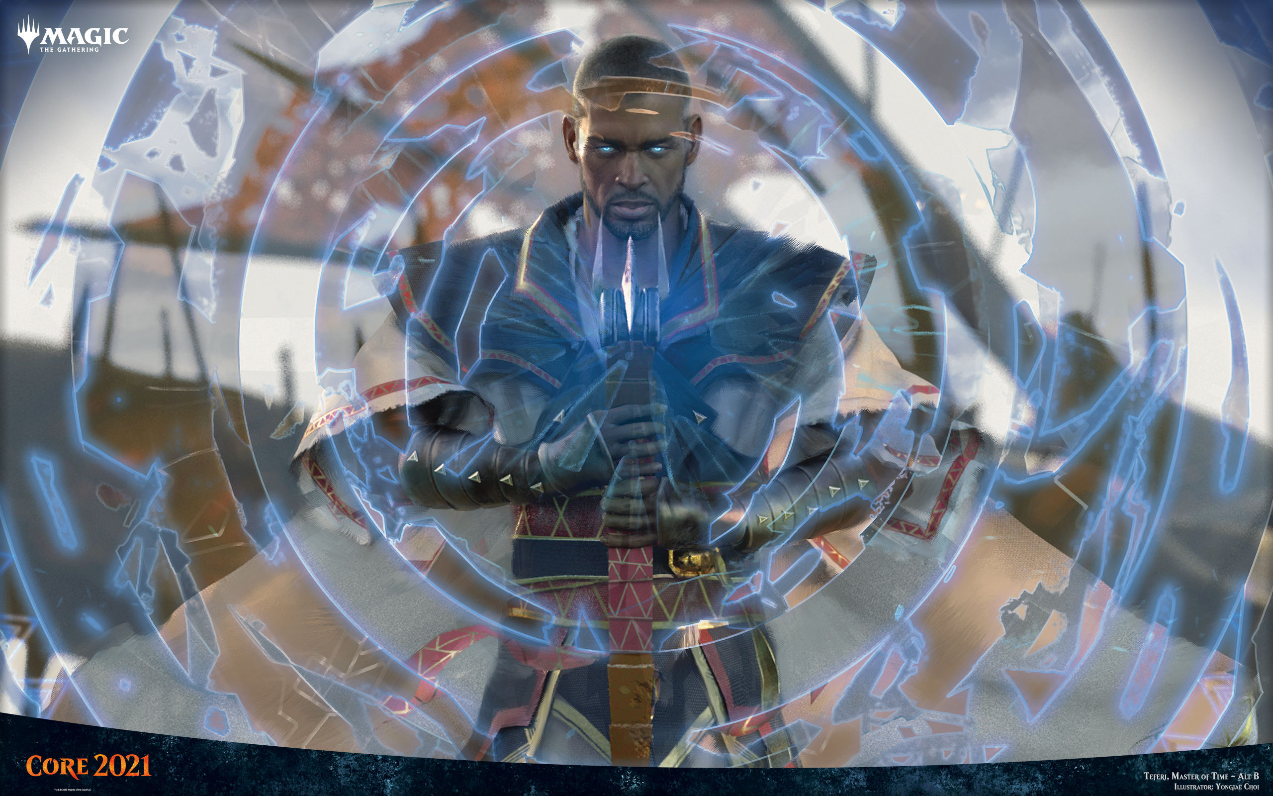 Pero, ¿por qué es importante el Core Set 2021? ¿Qué papel narrativo juega esta colección dentro del lore del juego? En Wizards, desde hace unos años, están centrado este tipo de sets bajo la figura de un Planeswalker concreto, si bien no hay una historia propiamente dicha. La colección de 2019 tenía a Nicol Bolas como gran protagonista, la de 2020 usaba a Chandra como imagen de marca y la colección de este año está centrada en Teferi, uno de los caminantes de planos que se unió a los llamados Guardianes durante todo el arco narrativo de Nicol Bolas y la famosa Guerra de la Chispa. Teferi es un mago del tiempo que tiene más de 1200 años, y aunque es de noble corazón y tiene un gran sentido del humor, se arrepiente de haber tomado ciertas decisiones a lo largo de su vida. Usándolo como eje, se han apoyado en sus aliados, amigos y seres conocidos para convertirlos en criaturas legendarias y así incluirlas en la colección para darle cohesión temática a todo el conjunto de cartas de este set. Las colecciones básicas siempre se basan en un ciclo de planeswalkers monocolores, un elemento que se usa para ayudar a los jugadores novatos a iniciarse y que representan a la perfección la jerarquía de maná de Magic.