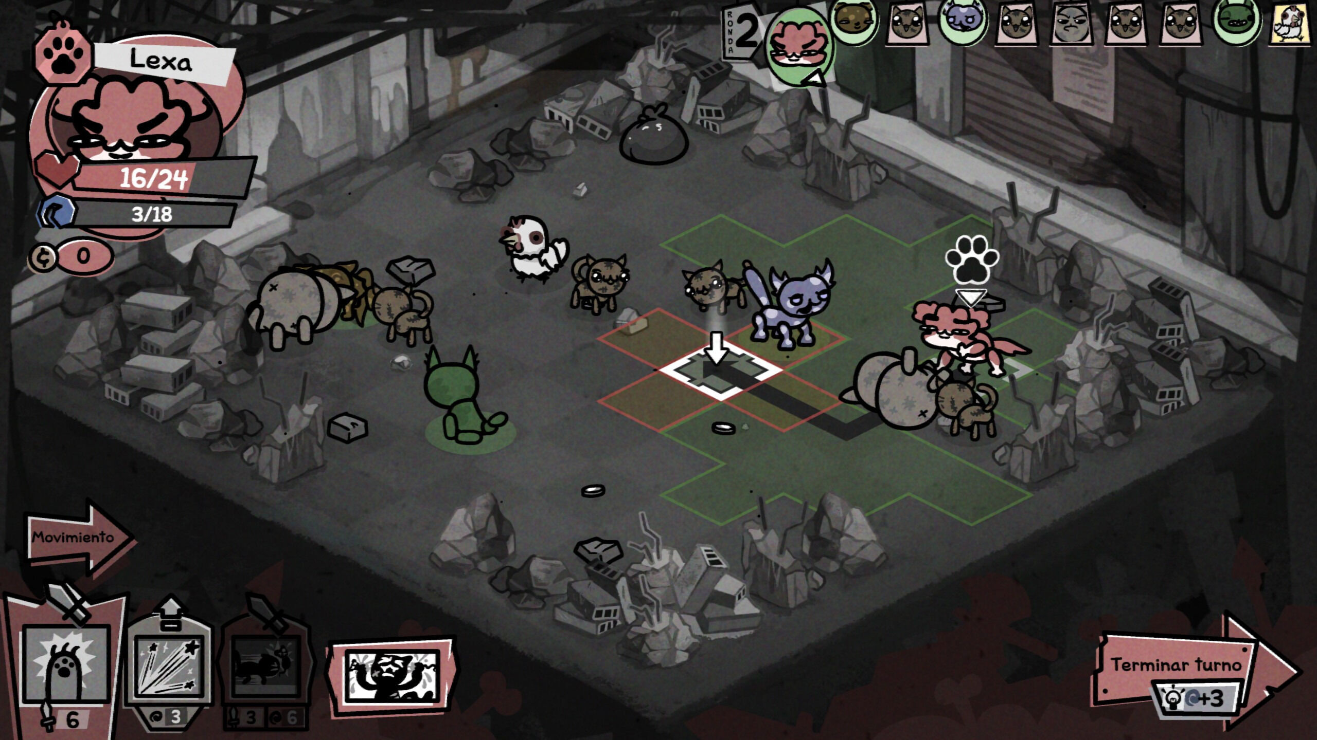 Pero Mewgenics también es increíble porque, una vez superas el shock de su estética de caca, sangre y vísceras, te das cuenta de que puede convertirse en un imprescindible de la estrategia táctica. Lo que sobre el papel parecía un simulador de criar gatos, a los mandos se revela como un sucesor espiritual macarra y sistémico de Into the Breach. Es un roguelite donde el posicionamiento lo es todo, donde cada casilla del tablero cuenta y donde la interacción con el entorno (ya sea empujando a un enemigo contra un cactus o haciendo que tu gato defeque para bloquear un camino) es tan importante como el ataque más poderoso.