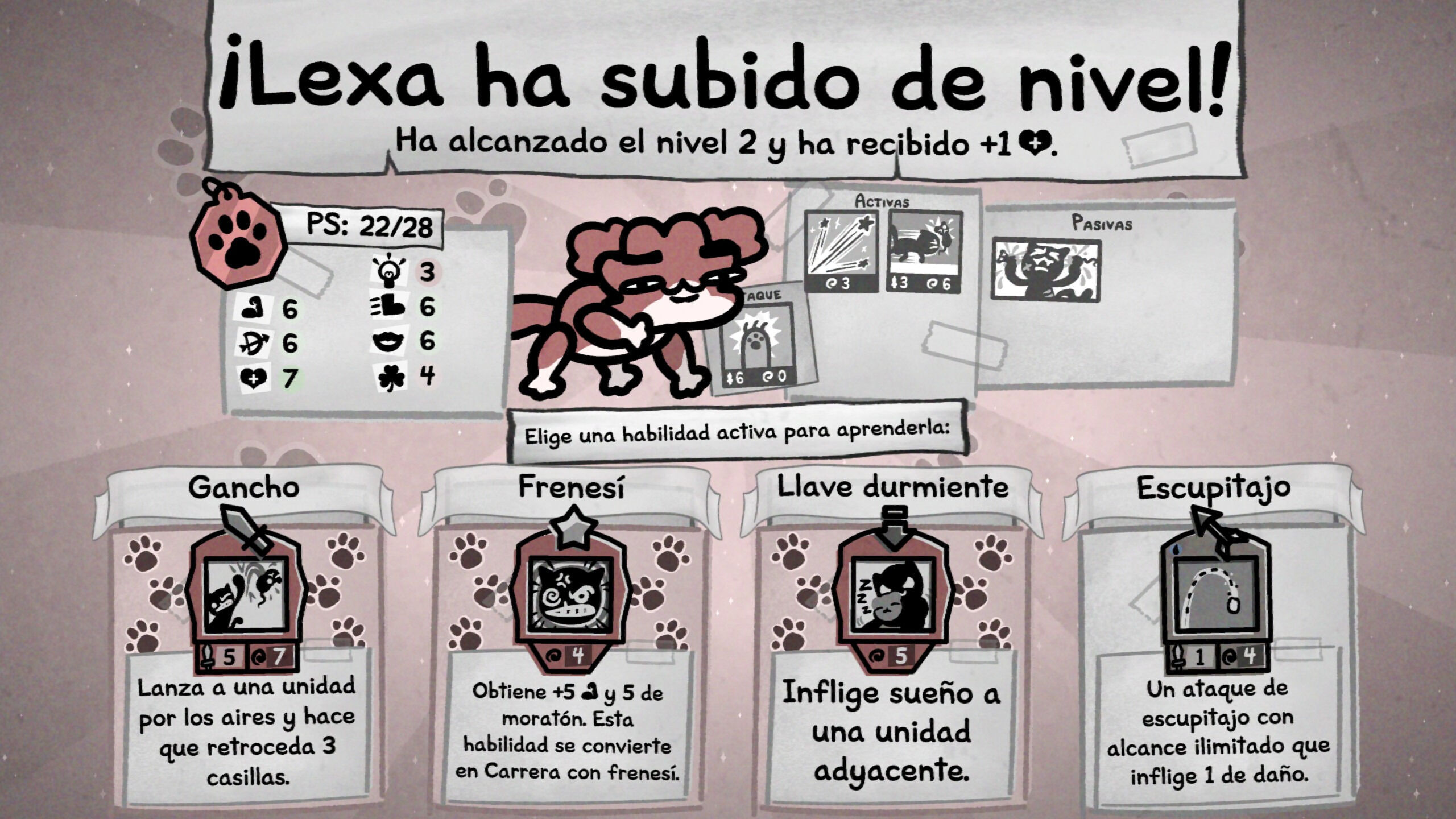 Los gatos van subiendo de nivel durante la 'run' y desbloqueas nuevas habilidades (activas y pasivas) que van dándole profundidad a su gameplay.