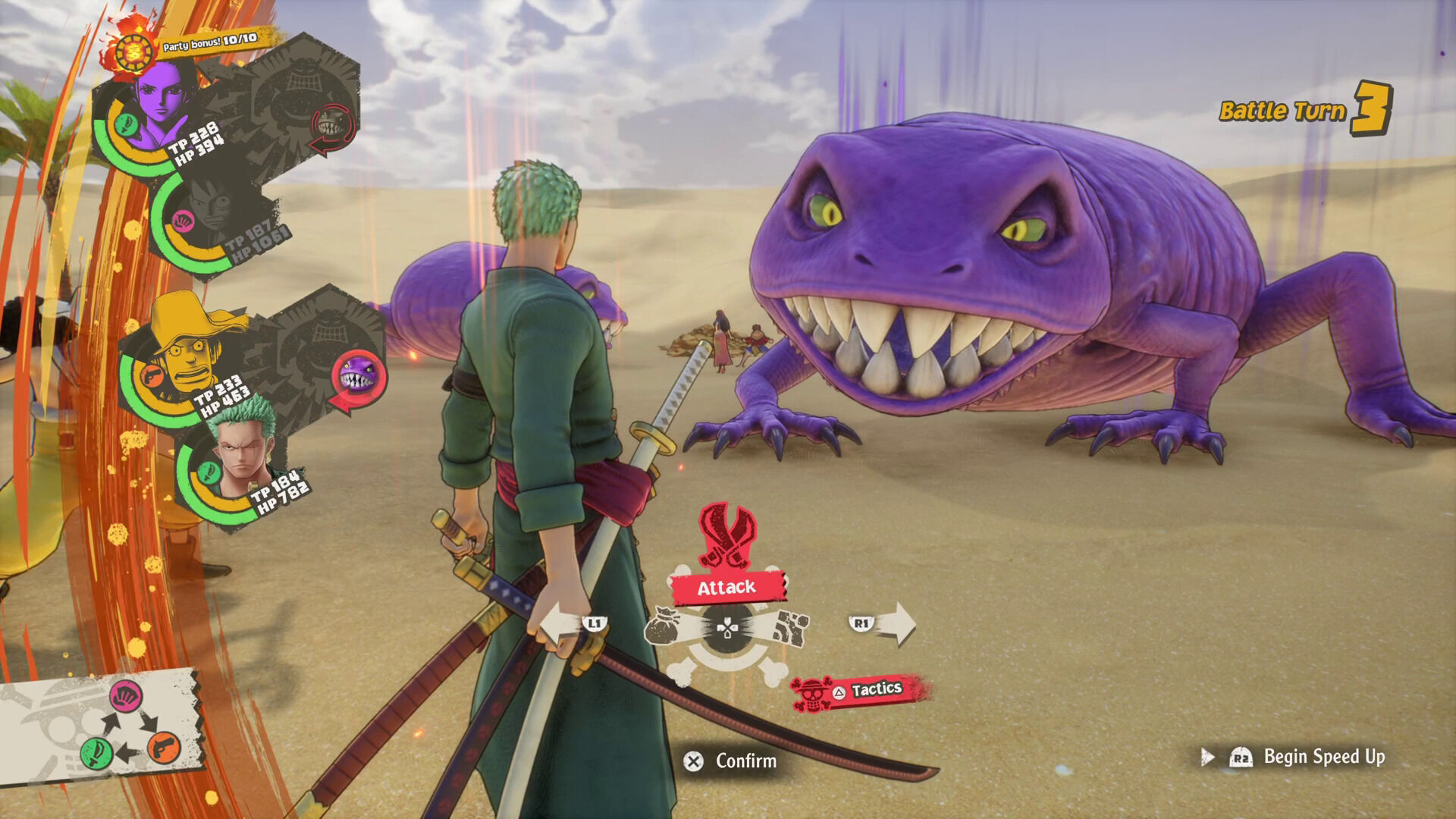 Sumadle que los personajes y enemigos se dividen en tres tipos distintos al más puro estilo piedra, papel y tijeras, que podemos relevar siempre que queramos a cualquier miembro de la tripulación para adaptarnos a lo que ocurra durante una pelea, que la energía necesaria para realizar técnicas se genera a base de golpes básicos y que cuando nos toque actuar podremos decidir qué héroe queremos que consuma su acción en cada momento.