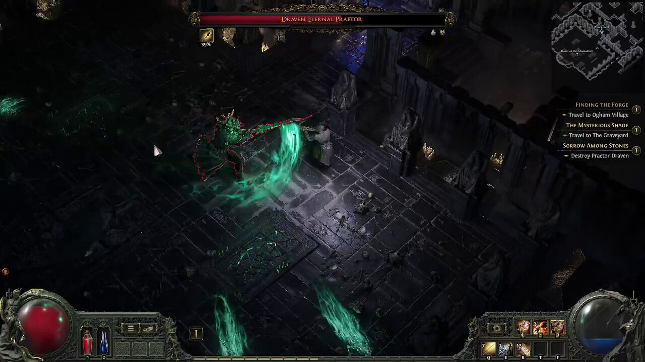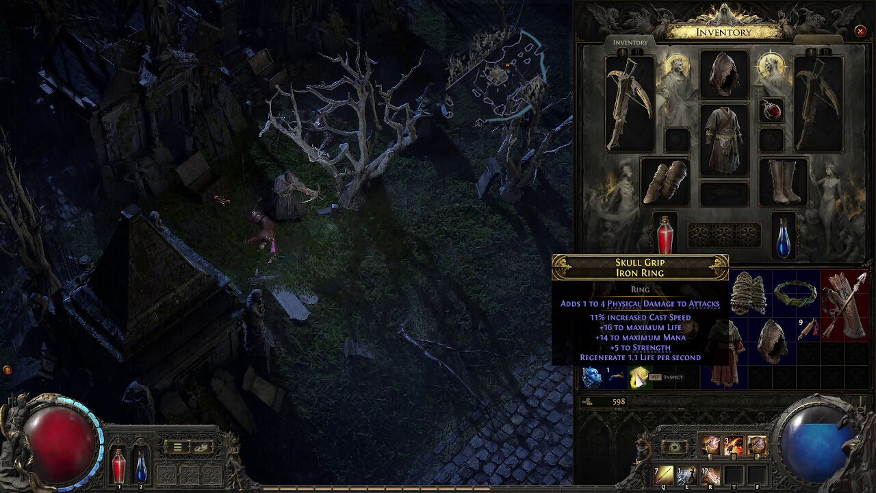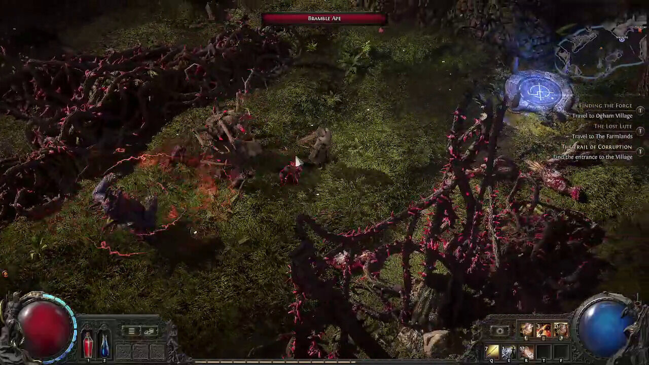 Un camino que, al menos estructuralmente, es bastante tradicional. Wraeclast no es un mundo abierto, sino que cada uno de sus actos se estructura en torno a una base de operaciones (con comerciantes, personajes que dan misiones y otros jugadores) a la que volveremos frecuentemente para vender o identificar la gran cantidad de equipo que conseguimos y para rellenar nuestros dos frascos, uno de salud y otro de maná. Conforme exploramos las zonas que la rodean, desbloqueamos puntos de viaje rápido hasta la base, lo que nos ahorra largas caminatas y peligros. Al menos en el primer acto, cada una de esas áreas a explorar tenía una ambientación particular, distintiva, pero siempre macabra: desde el oscuro bosque del principio a la villa cubierta por las llamas, pasando por una colorida selva plagada de espinas o un laberíntico palacio muy detallado.