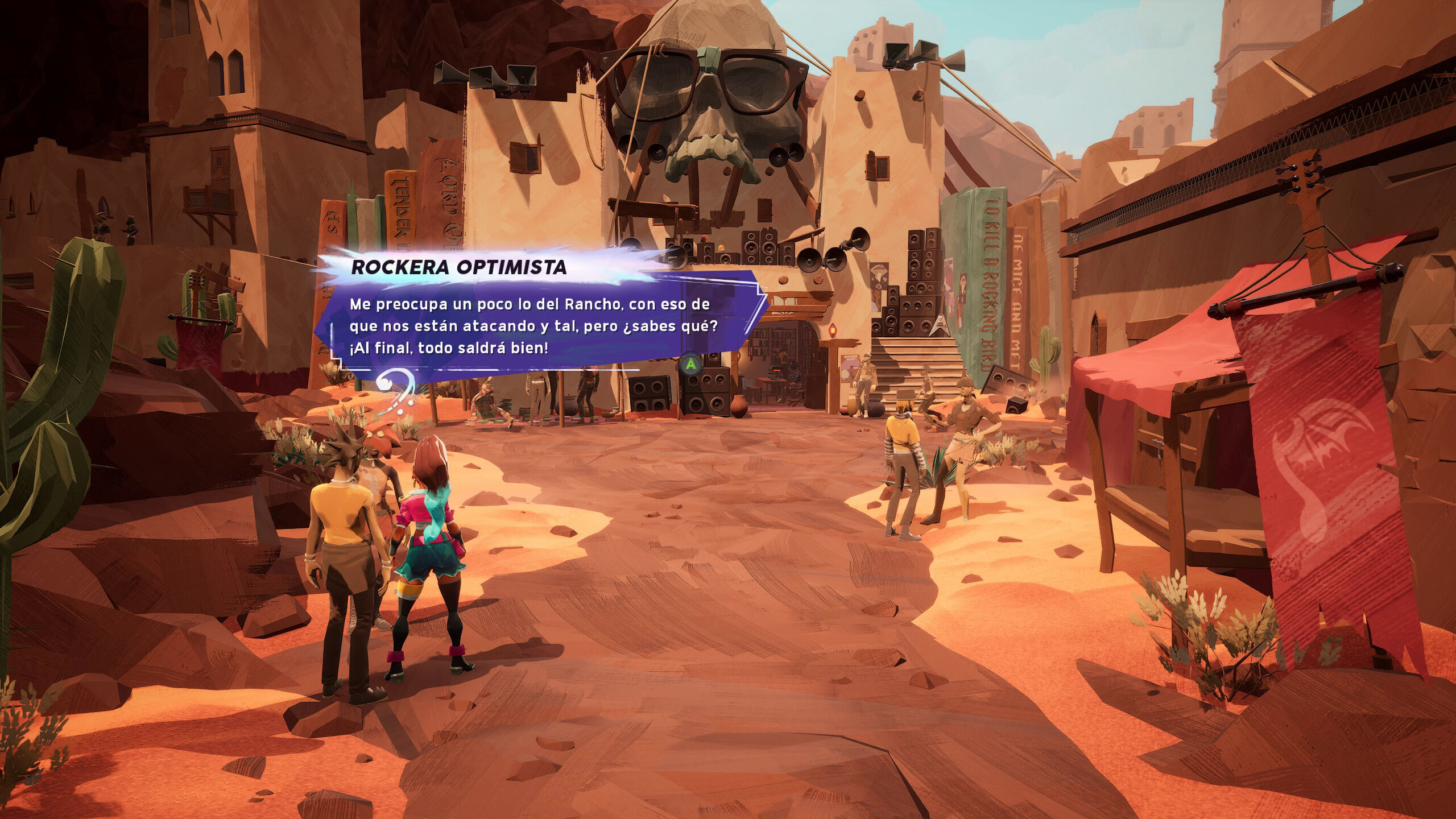 El rock ha evolucionado, pero también se han creado divisiones tan absurdas como las que suceden en nuestro mundo: los punkis no quieren saber nada de los aficionados al grunge y los metaleros desdeñan el rock clásico. De todo ello nos enteramos charlando con los habitantes en unos diálogos breves, propios de RPG japonés, que no tienen mucha chicha, pero que en alguna ocasión nos han sacado una sonrisa, por un humor que nos ha recordado al fantástico Brutal Legend como, sobre todo, por una traducción genial a la que volveremos más adelante.