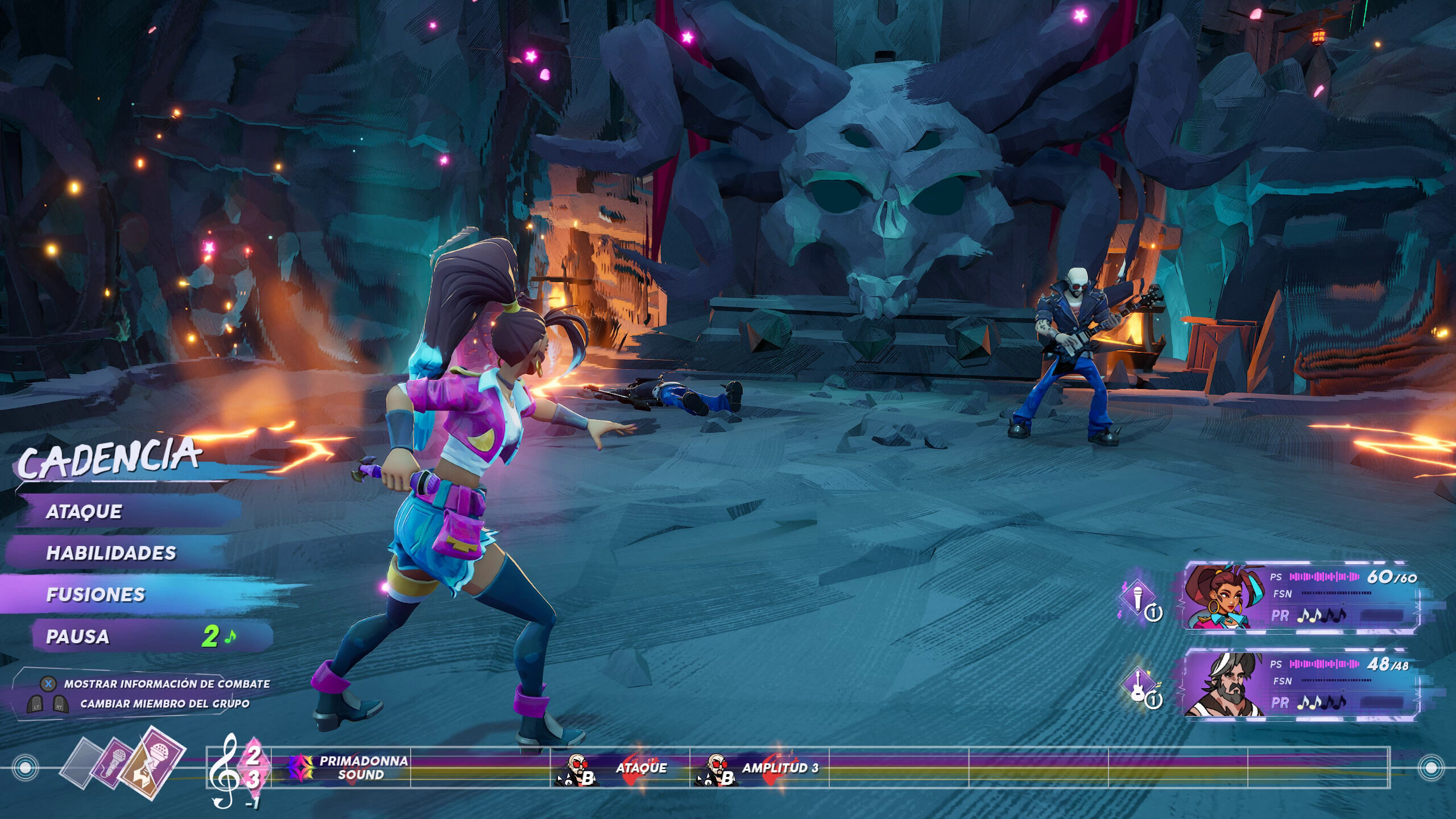 Y conforme el grupo crezca en tamaño, también aumentará la complejidad y la diversidad de los combates por turnos. Como decíamos, no son combates de ritmo, pero sí que tienen una nomenclatura y una temática musical que les da un sabor bastante único. Los turnos son estrofas y se dividen en compases. La tablatura en pantalla muestra las acciones que realizará cada participante y en qué orden, algo fundamental para planificar qué vamos a hacer y de qué nos tenemos que defender.