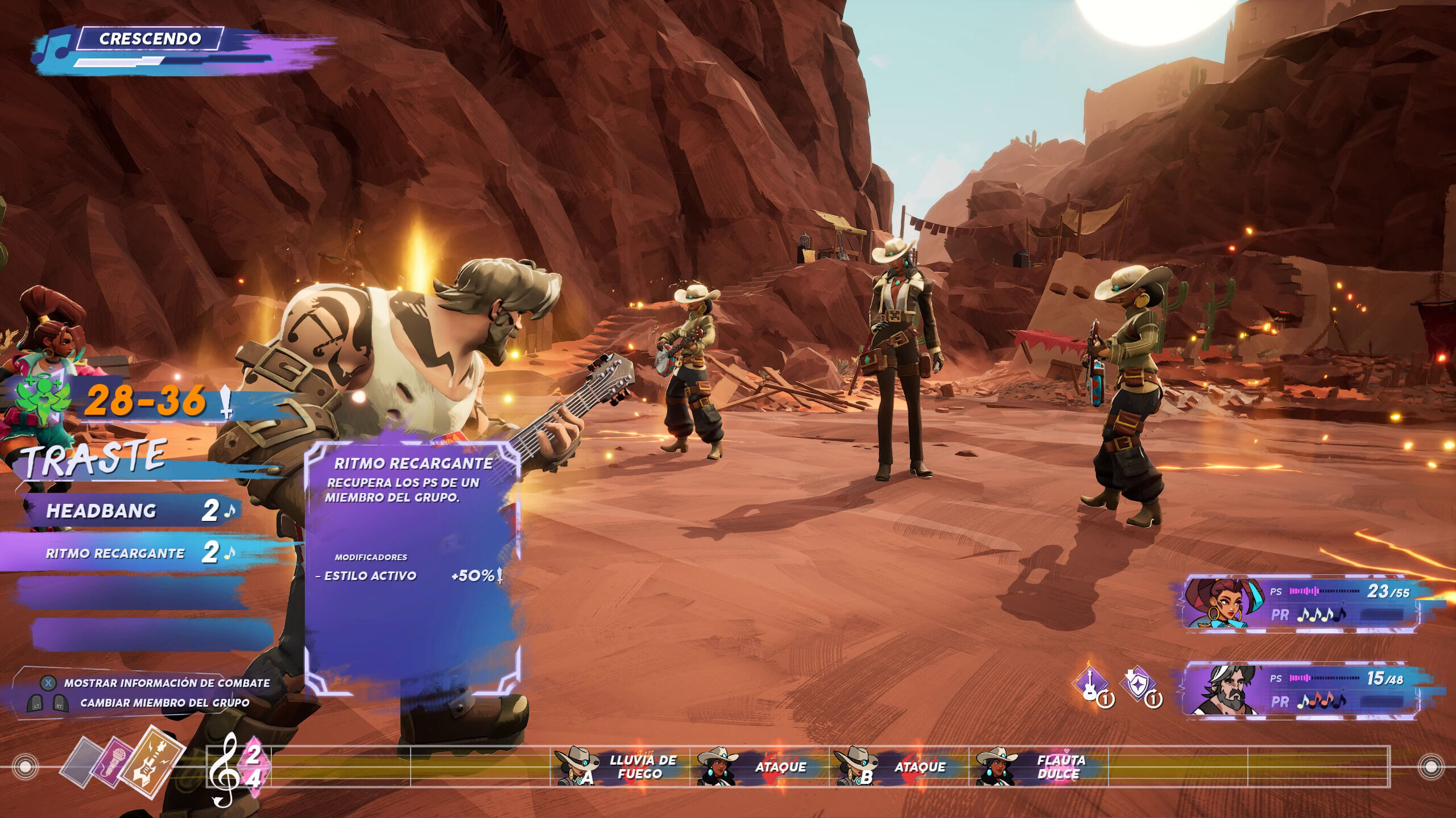 Los QTE que aparecen al ejecutar una habilidad son bastante fáciles de acertar, pero no tanto de hacerlo a la perfección, y en más de una ocasión eso puede suponer derrotar a un enemigo o no. A todo esto hay que sumar las energías musicales: en los combates se van alternando turnos donde prima el rocanrol o el pop, por ejemplo, y las acciones de nuestros personajes correspondientes a ese género se ven potenciadas.