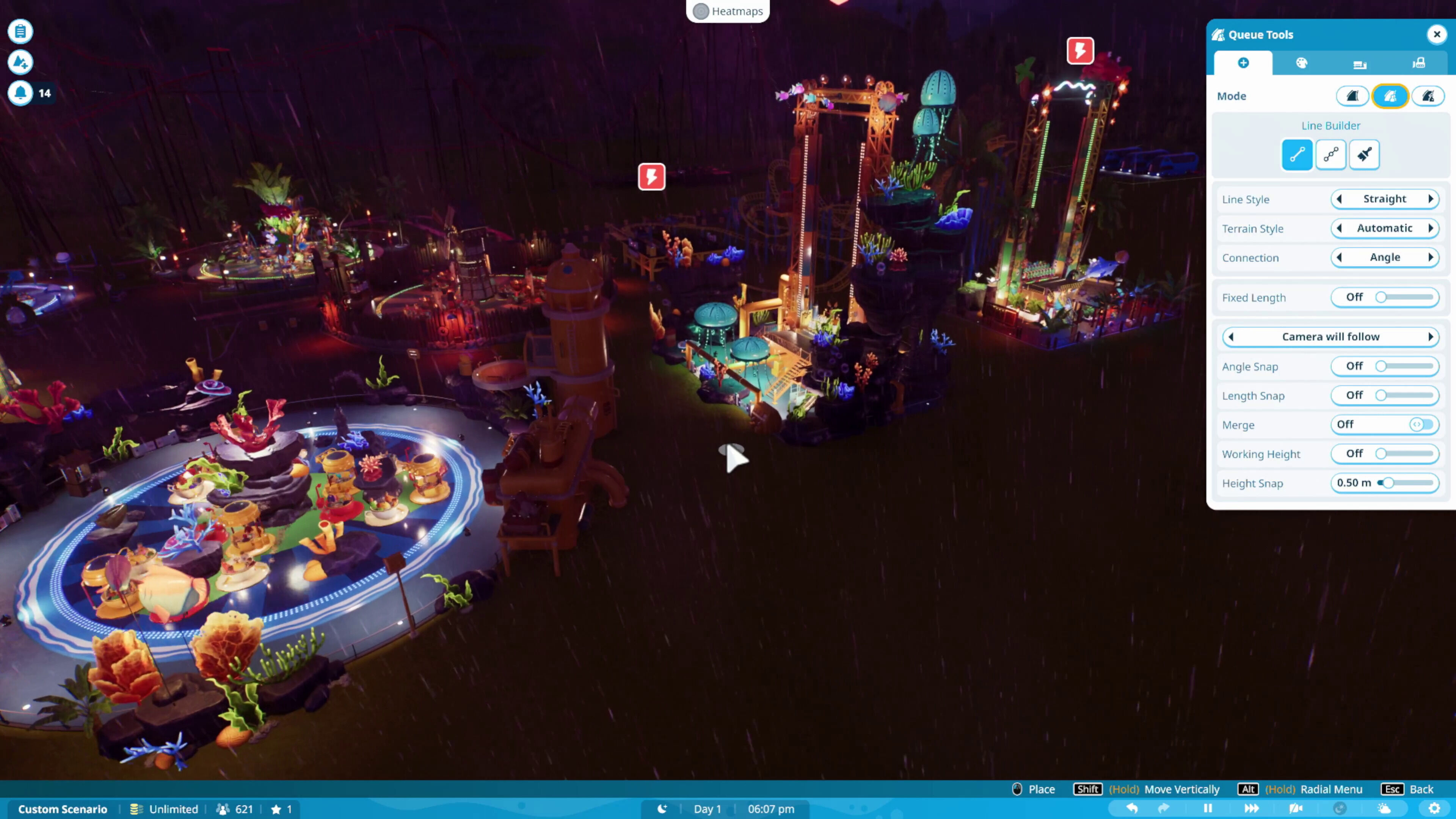 Crear un parque de este tipo sin restrucciones fue una experiencia divertida, aunque no estuvo exenta de "problemas" o desafíos a nivel jugable, como otorgar a las atracciones la suficiente electricidad o agua corriente a través de paneles solares o estaciones de bombeo para que las atracciones funcionasen con normalidad (por no hablar de otros detalles como crear vestuarios, contratar a una persona de mantenimiento...).