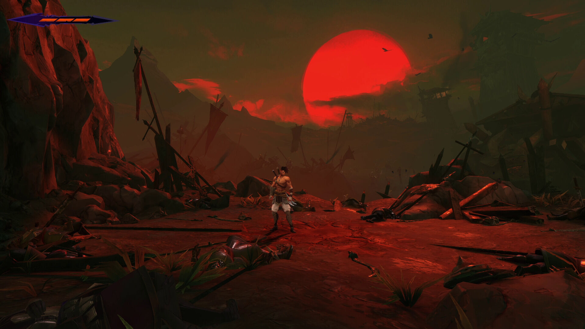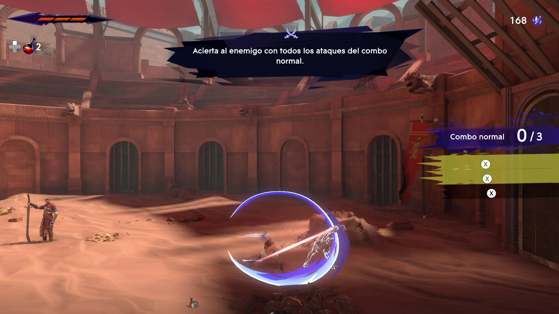 Un detalle que nos ha llamado la atención es que se trata de un juego exigente y desafiante no solo en el plataformeo, sino también en el combate, ya que perdona pocos errores durante las primeras horas. Empezamos con un máximo de tres porciones en nuestro indicador de salud y con tan solo una poción que podemos recargar en los puntos de control, y tras el prólogo que sirve de tutorial no tardamos en toparnos con enemigos capaces de quitarnos dos porciones de un solo guantazo. Y eso jugando en Normal. Tampoco es que sea muy difícil lidiar con ellos, ya que telegrafían de forma muy visible sus acciones, pero sí que es cierto que con esto consiguen que tengamos que estar muy atentos en todo momento y no nos podamos despistar ni un solo segundo. Además, suelen ser bastante agresivos y no van a esperar su turno para intentar rebanarnos el pescuezo, por lo que la sensación de peligro y tensión ha sido constante, especialmente cuando nuestros rivales aparecen en lugares donde también tenemos que plataformear.
