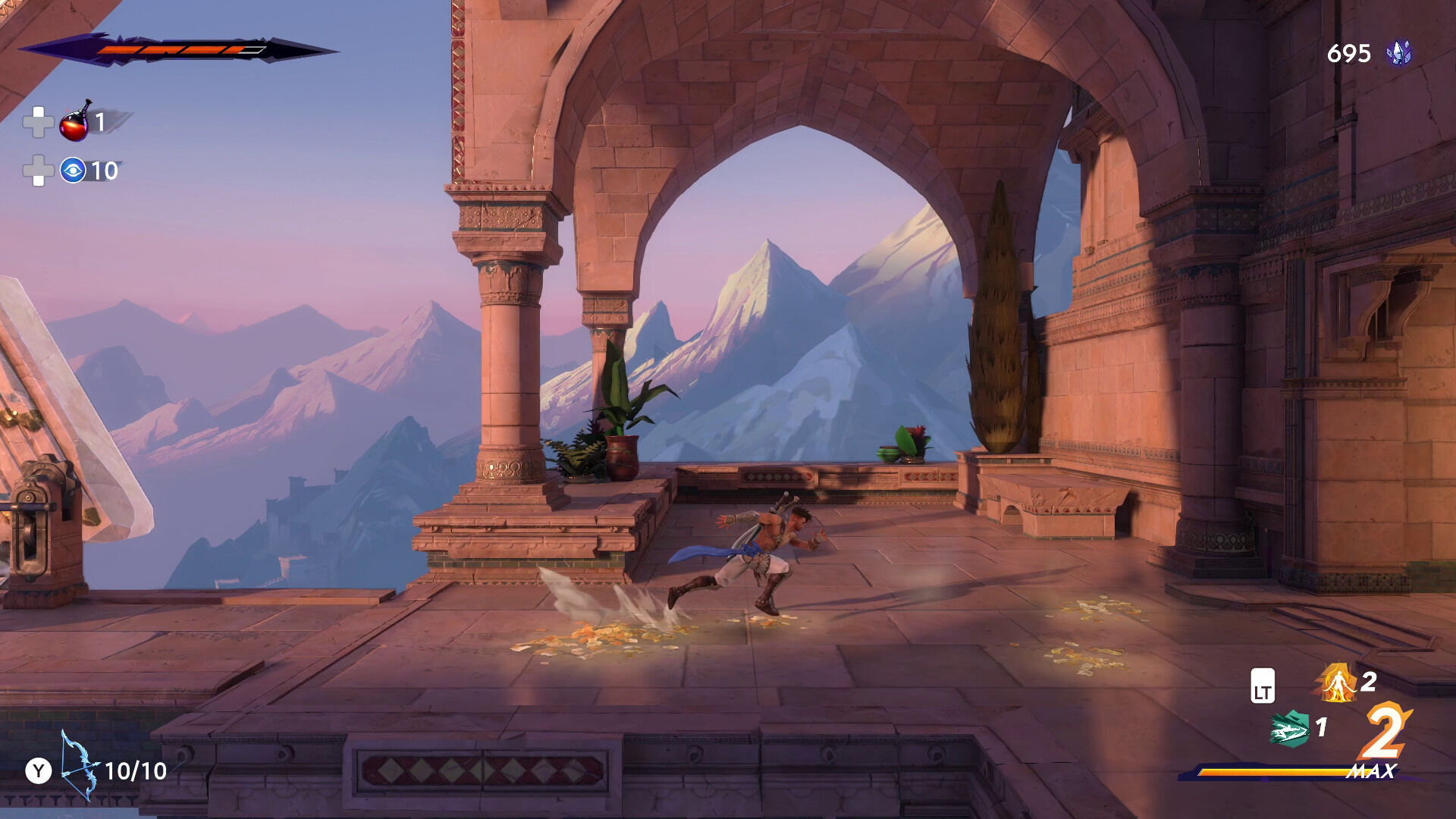 Lo primero que destaca aquí son, sin duda, sus controles. No solo hablamos de que Sargon responda con una precisión incomparable a todas nuestras órdenes, sino también de que su forma de moverse por los escenarios es simple y llanamente perfecta. Gran parte de la culpa de esto la tienen sus animaciones, ya que hace gala de una enorme cantidad de ellas, son brutalmente fluidas y las transiciones que se producen entre una y otra, independientemente de la postura en la que nos encontremos, consiguen que el simple hecho de mover al personaje resulte en una de las experiencias más gratificantes que hemos tenido con un videojuego. Sumadle unas físicas de salto espectaculares, un control aéreo magnífico que nos da mucho margen para rectificar y calcular la potencia y altura de nuestros brincos y que nuestro héroe es tremendamente ágil y puede realizar todo tipo de acrobacias, y podréis empezar a haceros una ligera idea de lo que Ubisoft Montpellier ha conseguido con esta producción, dejando bien patente toda la experiencia adquirida en estas lides tras desarrollar los imprescindibles Rayman Origins y Rayman Legends.