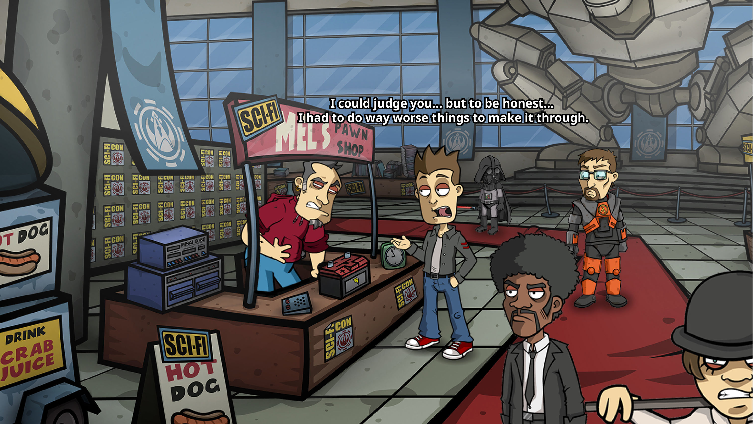 Estamos ante una comedia en la que se hace humor a través de los diálogos, las situaciones y con un montón de referencias a la cultura pop de los 80, 90 y 2000, referencias frikis del mundo del cine, la televisión, los cómics y los videojuegos. En la demo que nos mostraron en la gamescom, y en apenas diez minutos, pudimos ver y detectar un sinfín de guiños que no dejaban de aparecer en pantalla: Blade Runner, Aliens, Day of the Tentacle, El planeta de los simios, Perdidos (Lost), Rocky, Big Bang Theory, Futurama, Half-Life, Watchmen y por supuesto Monkey Island, la obra cumbre dentro del género a la que se homenajea de múltiples formas. Referencias a veces más obvias, otras más sutiles y escondidas, pero que siempre están ahí esperando a ser descubiertas, lo que es divertido de por sí.