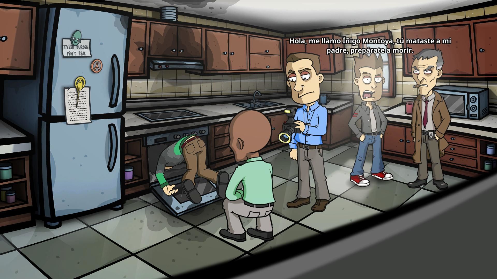 De momento el desarrollo es bastante lineal, y hay que ir realizando las acciones en un orden muy concreto, no tenemos demasiada libertad para resolver varios puzles en paralelo. Esperamos que según avancemos en la trama y tengamos más localizaciones disponibles, la aventura se "abra" un poco, y nos dé más libertad para actuar. De momento nos lo estamos pasando en grande, con los divertidos diálogos, la enorme cantidad de referencias frikis, que nos encantan, y una historia que aunque sencilla, mantiene nuestro interés.