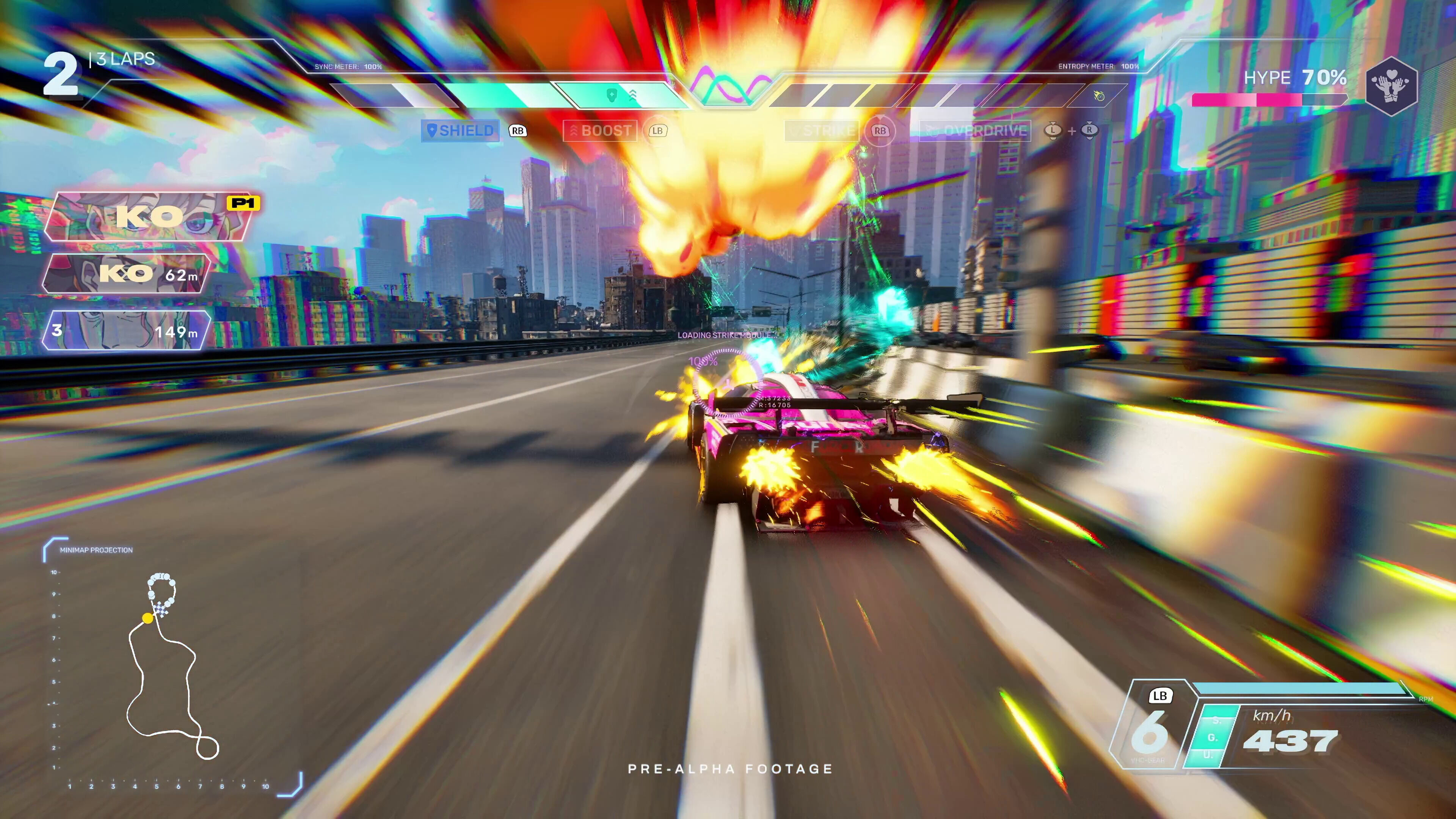 Al consumir un fragmento de la barra de Sync, se usa el turbo, que encima se potencia si soltamos el botón cuando toca; eso sí, hay que tener cuidado de no quedarnos a cero, pues también se utiliza esa energía para activar los escudos. ¿Para qué queremos escudos? Porque los desarrolladores también se han fijado en Burnout: hay maneras de dejar KO a los oponentes y de que ellos nos hagan lo propio. Aunque volvemos al circuito casi inmediatamente, a buen seguro que perderemos un puñado de posiciones.