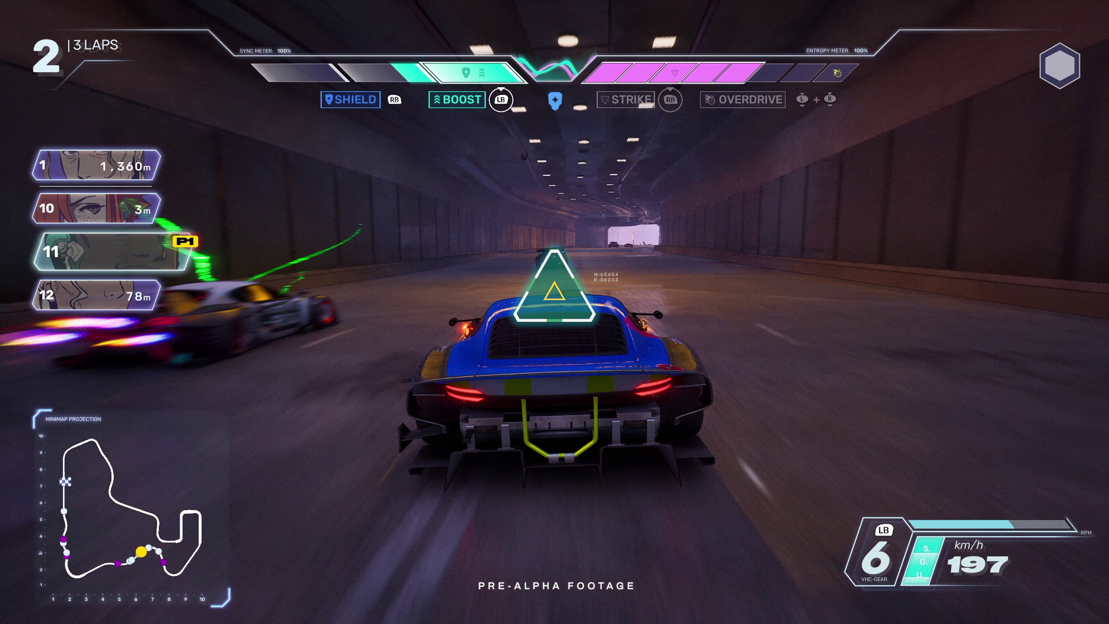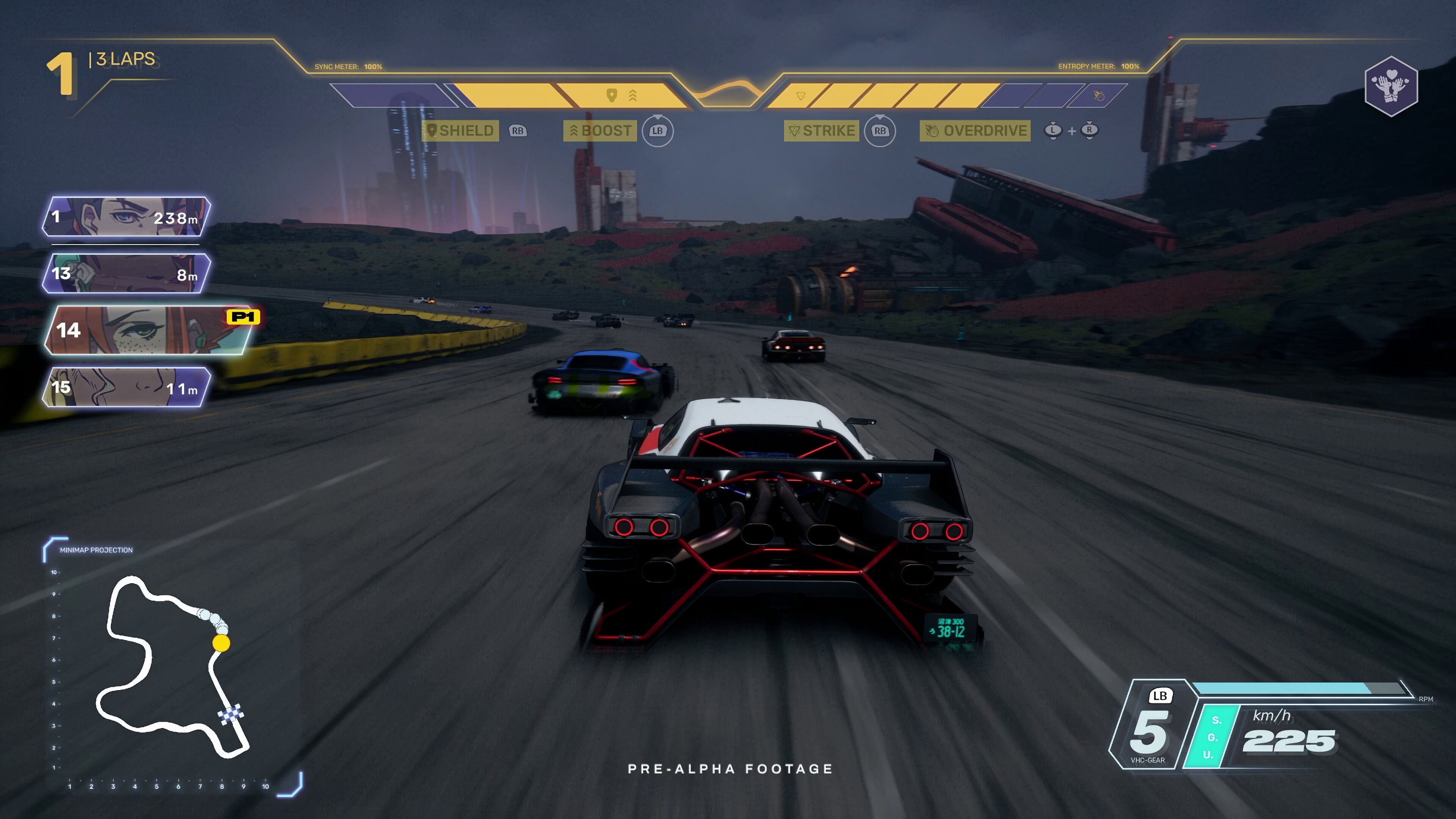 Cada uno, al menos entre los seis que pudimos probar, se percibe realmente diferente a los mandos; además de diferente velocidad punta, manejo, aceleración y otras estadísticas habituales, cada cual tiene más o menos fragmentos en las barras de sincronización y entropía, por lo que las estrategias a seguir serán distintas dependiendo del personaje, divididos, por cierto, en equipos de tres, cada cual con su líder, más complejo de manejar.