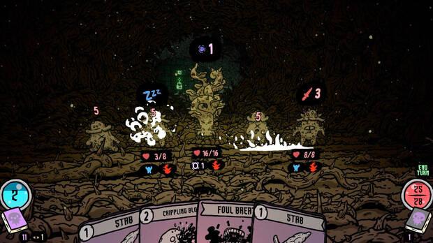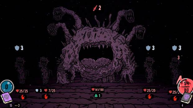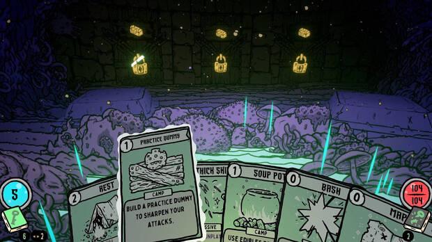 Además de luchar, en las mazmorras también encontraremos varias tiendas regentadas por extraños seres en las que podemos intercambiar objetos por cartas específicas. Para poder conseguir algo de comida, primero hemos de obtener la carta que nos permite cocinar una sopa y que, más tarde, podremos intercambiar. Sin embargo, las cartas de la sopa pueden generar poderosos ataques a múltiples enemigos, así que haríamos bien en pensar determinadamente si esto es realmente lo que nos interesa en cada momento. La naturaleza roguelike del juego nos lleva a explorar una y otra vez las mismas zonas bajo la premisa de que aquí mejora nuestro mazo y no nosotros de forma personal, así que podemos ir experimentando con todos los elementos que tenemos a nuestra disposición para entender los efectos negativos y positivos de cada uno de ellos.