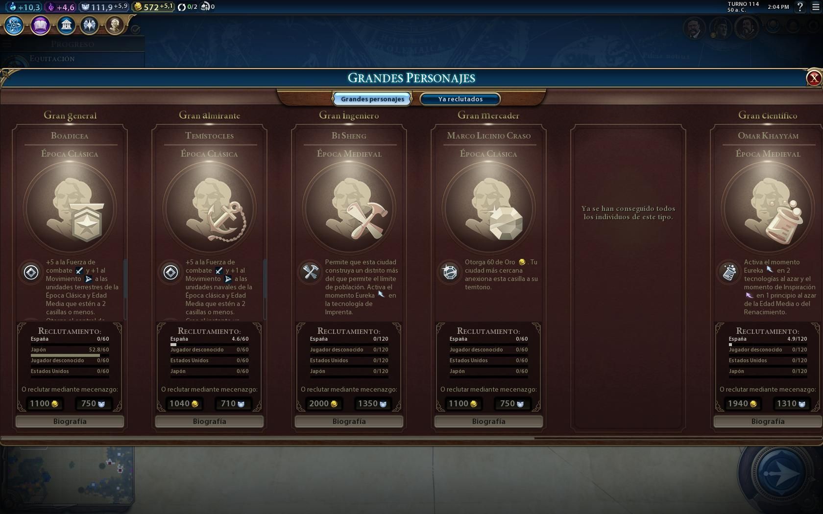En la gestión de las grandes personalidades tienen se aprecia de forma muy nítida este interés por ofrecer todo de forma visual. A través de edificios, distritos, políticas y algunas maravillas (o directamente con oro o con fe) vas sumando puntos para conseguir un gran general, profeta, científico, almirante... y en la pantalla de información de Grandes Personalidades vas viendo los puntos que llevas y que te faltan para conseguir cada uno de ellos, y cómo vas en relación al resto de facciones que hay en la partida. Nunca ha estado tan claro qué consigues con cada paso que das en el juego.