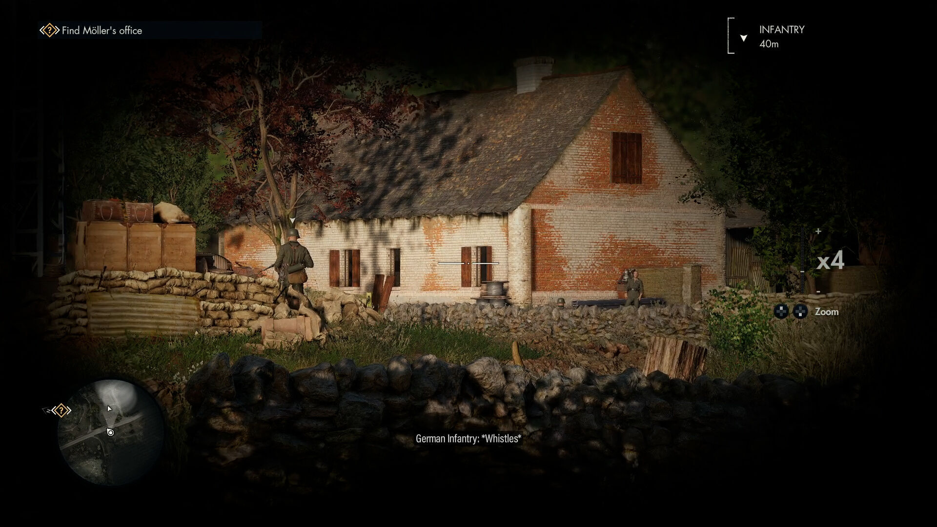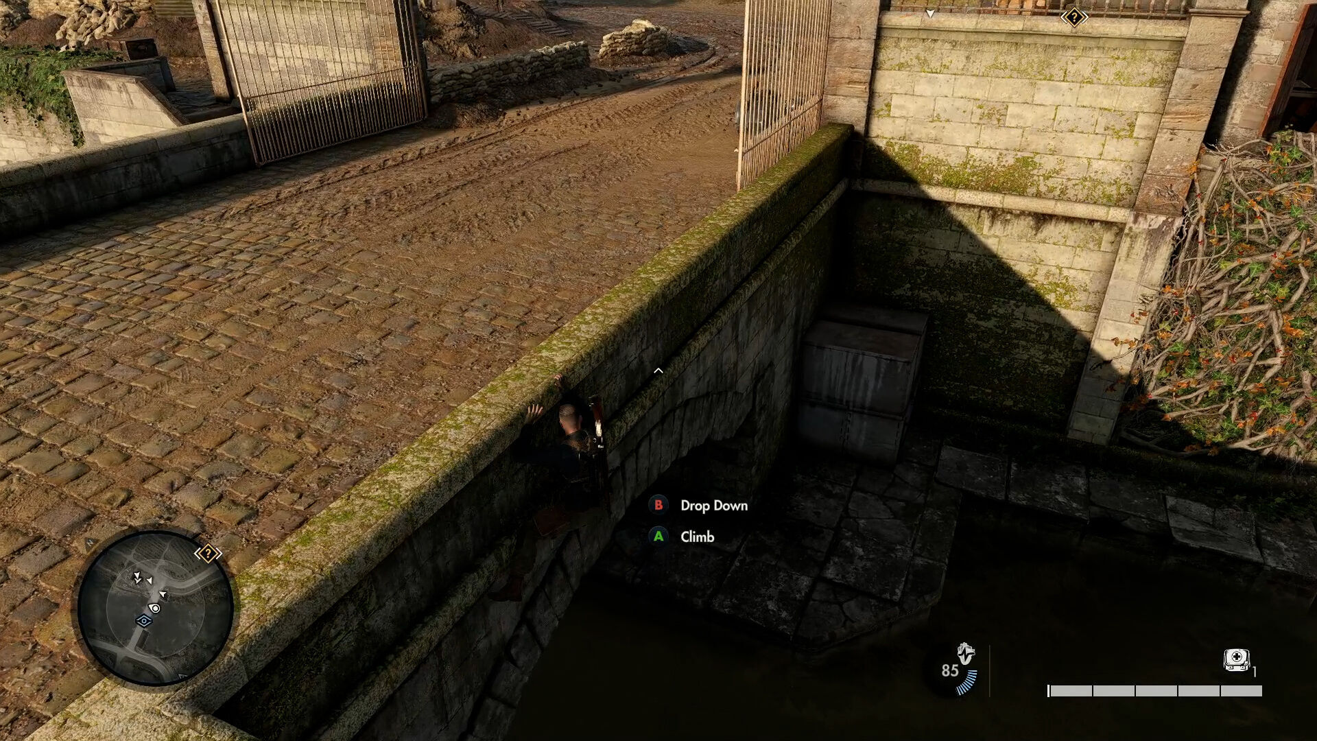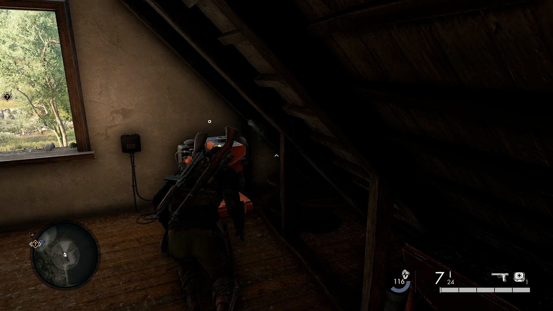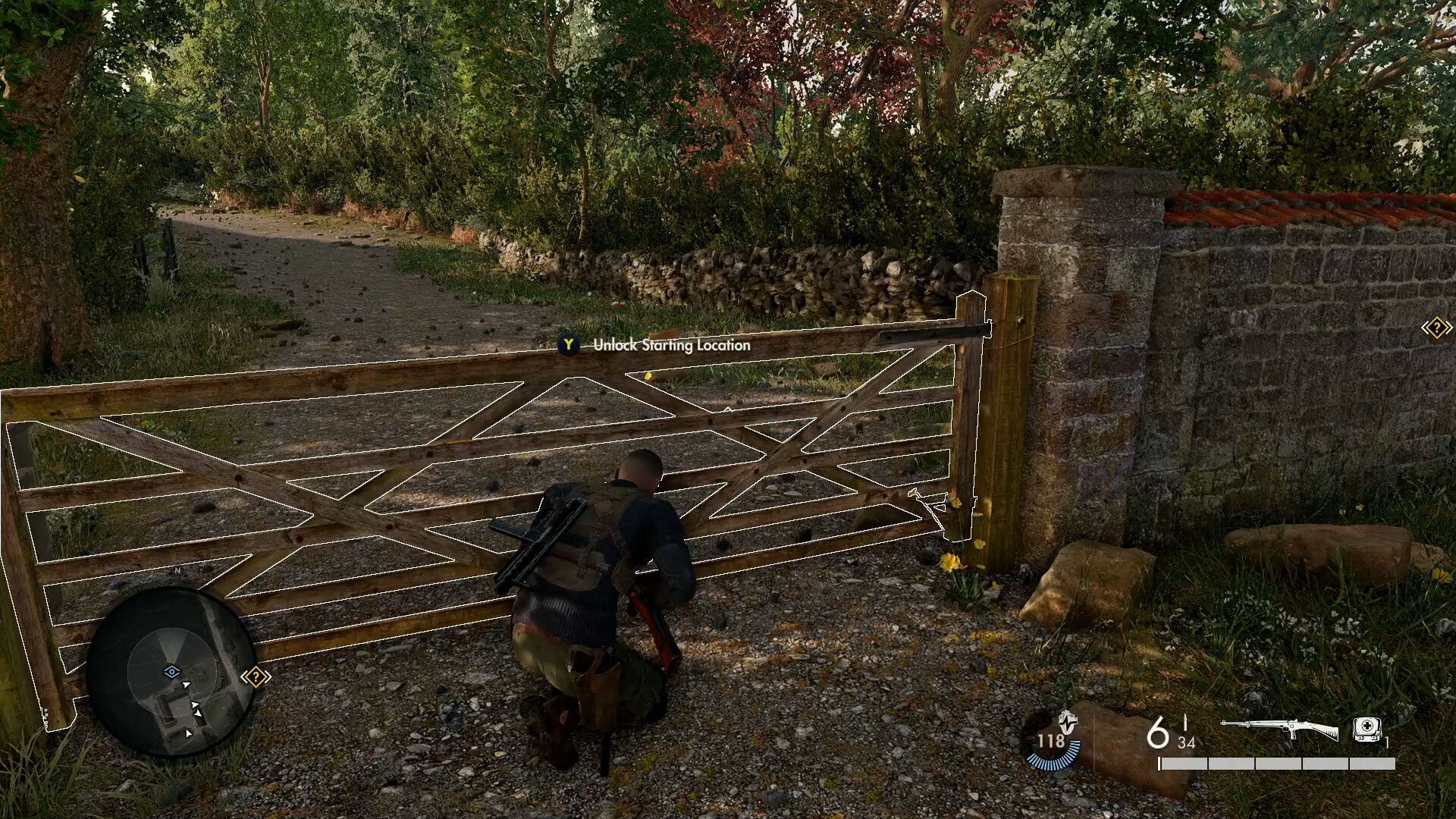 El escenario, una frondosa campiña francesa repleta de caminos donde de cuando en cuando pasaban patrullas; con cabañas y establos aquí y allá que hacían las veces de puntos de control del ejército nazi; y un gran castillo repleto de salas, recovecos y atajos, dominando el horizonte y dejando claro que era nuestro objetivo, por si los iconos en el mapa no lo dejaban lo suficientemente claro. Un nivel que, si bien ofrece varias alternativas a la hora de llegar y abordar nuestro objetivo, es más limitado de lo que parece en un primer vistazo. Se detectan rápidamente las distintas rutas que tomar, pero dentro de esos caminos hay menos margen de maniobra del esperado: hay zonas de hierba alta para escondernos de las tropas, varios niveles de altura y construcciones que usar de cobertura; pero hay muros claros que nos impiden trepar o bajar, que evitan que nos salgamos del camino establecido. Esto choca con su apuesta por lo vertical: subimos muchas escaleras de mano, nos encaramamos de los muros del castillo y pasamos desapercibidos avanzando por un puente colgados desde el exterior; pero nos llevará un rato identificar dónde tenemos esta libertad, y habitualmente la única opción será seguir un camino recto escondiéndose de cuando en cuando.