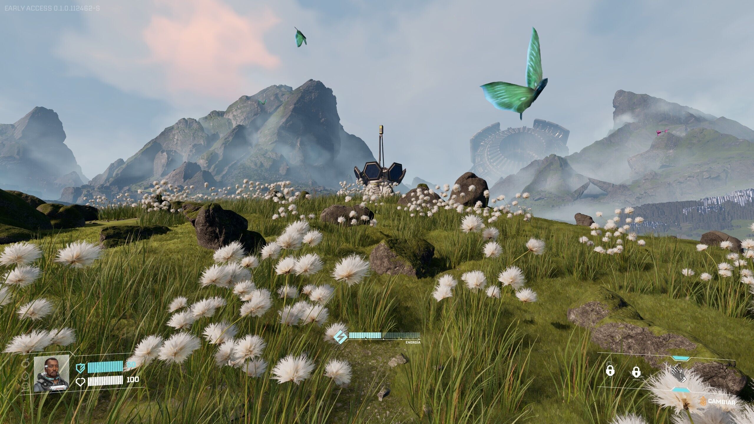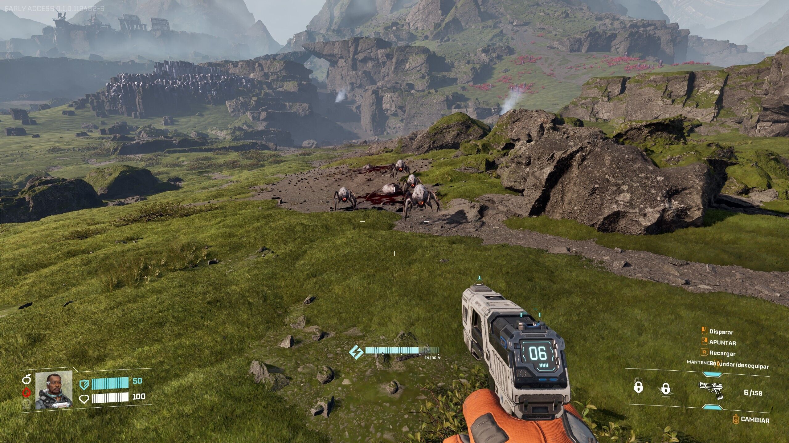 Pero lo dicho, tocaba explorar de nuevo en busca de recursos. Solo que esta vez llevábamos una pistola en el inventario. Un arma que no tardamos en tener que utilizar. El bestiario alienígena, al menos el que nos hemos encontrado en el acceso anticipado, es poco variado, pero estos insectos gigantes, algunos incesantes y otros explosivos, atacan en multitud. No son los enemigos más estimulantes a los que nos hemos enfrentado en un videojuego, pero su manera de moverse y sobre todo el satisfactorio gunplay consiguen que los combates sean divertidos. Menos mal que es así, porque los hubo en cantidad cuando nos adentramos en lo que parecía ser una base, como la nuestra, abandonada. Tuvimos que huir de allí, pero con útiles recursos y consumibles en el inventario, y nuevos conocimientos (y dudas) de lo que llevaba tiempo ocurriendo en este planeta.
