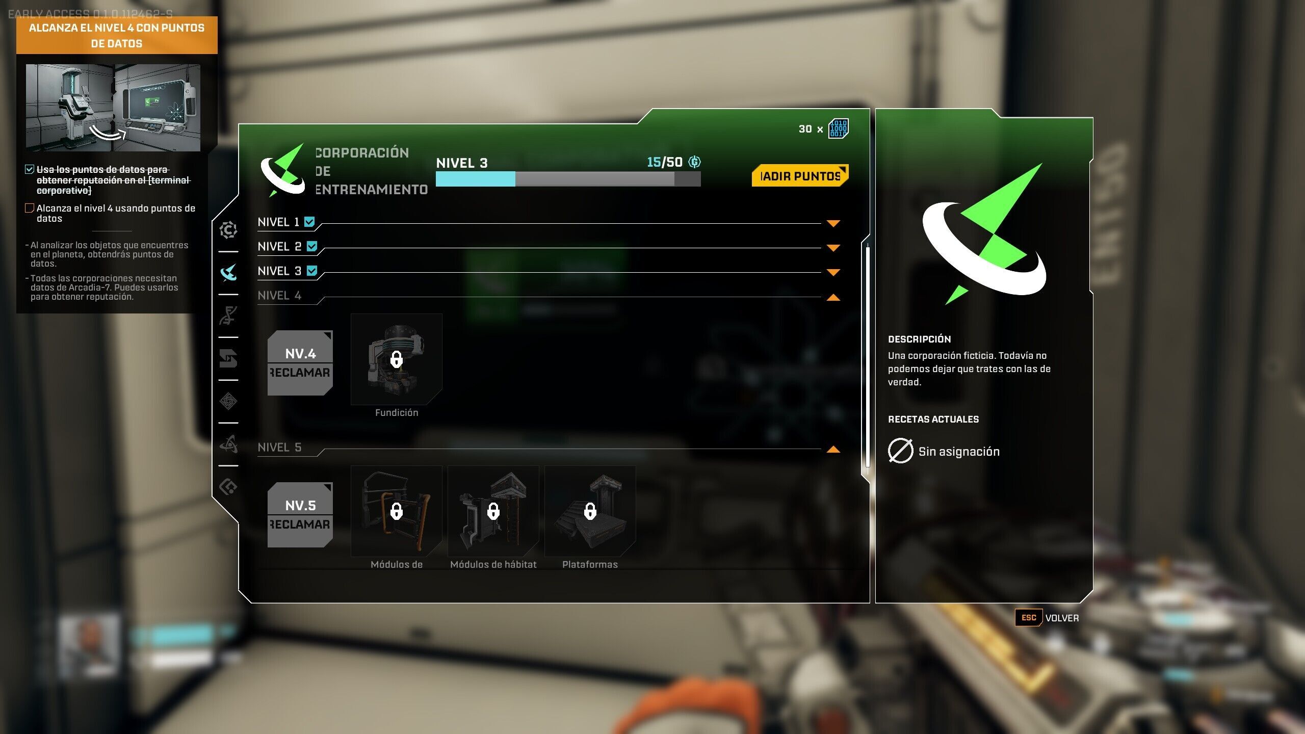 Tras unos minutos de partida ya habíamos construido el ordenador desde el que aceptar encargos (al principio solo de la compañía que hace de tutorial, después de otras cinco) y una de las lanzaderas desde las que seleccionamos a qué corporación enviar qué recurso; conforme lo hacemos, sube nuestro nivel con esa empresa, lo que nos desbloquea nuevas edificaciones, utensilios y materiales. Todo ello con la misma facilidad que el hábitat. Y lo mismo hicimos con la mina, que extrae automáticamente (siempre y cuando le llegue energía) el mineral sobre el que la hayas construido.