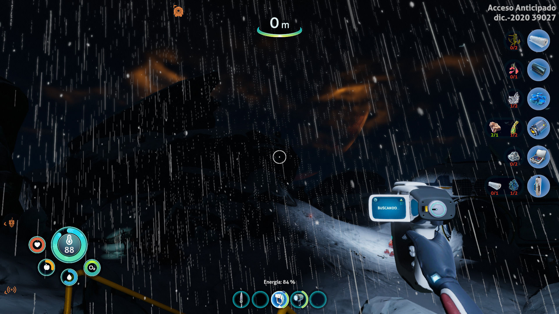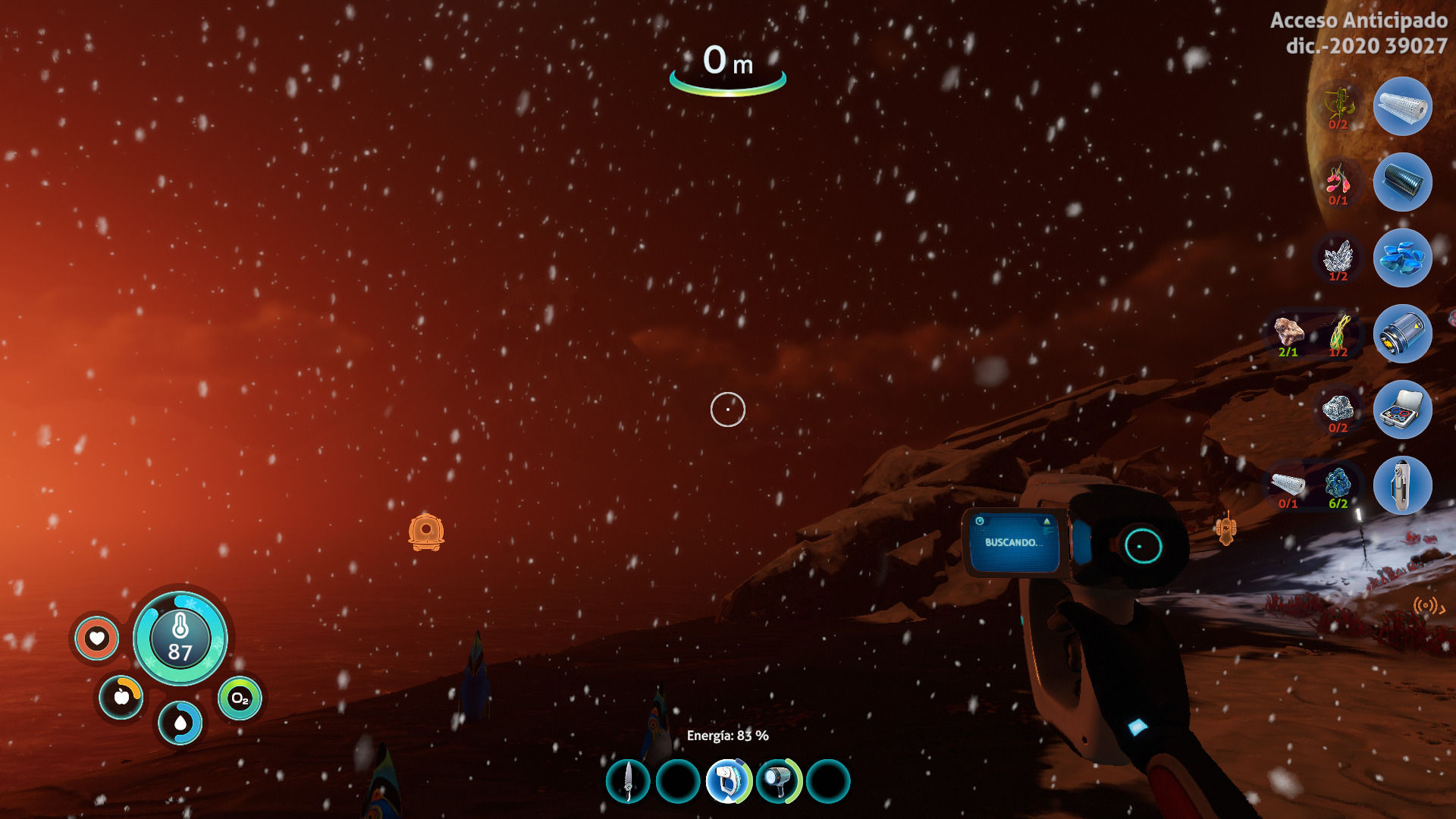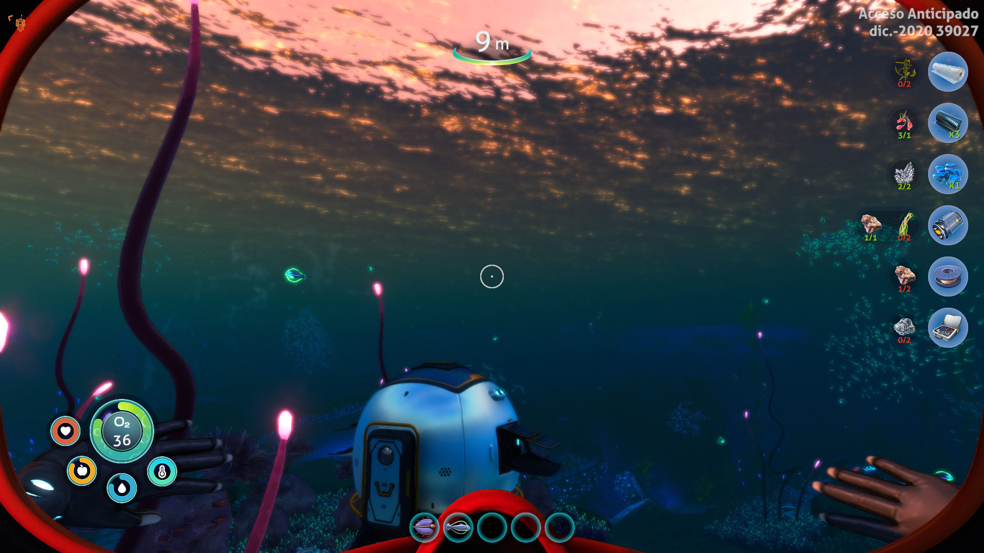 Durante esos primeros compases comenzamos a explorar los alrededores de nuestra pequeña base (apenas una cabina con un inventario y una mesa de fabricación) para conseguir materiales con los que hacernos con aletas para nadar más rápido, cocinar pescado alienígena, procurarnos un cuchillo con el que cortar plantas necesarias para obtener otros recursos y tener acceso a una bombona de oxígeno que nos permita pasar más tiempo sin subir a la superficie entre cada zambullida. Lo que nos ha sorprendido es que en cada momento que empezábamos a sentir que no sabíamos que hacer (algo habitual en el género), la PDA nos indicaba que se ha detectado tal equipo abandonado más allá, o que se ha percibido una señal de vida en tal lugar.
