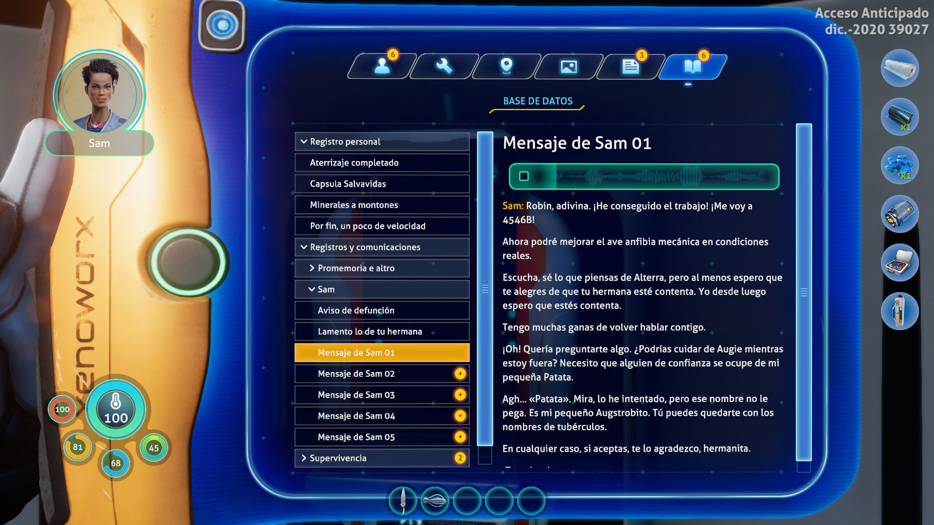 Durante este primer par de horas hemos descubierto que hay alguien más que lleva años viviendo en el planeta 4546B, pues hemos explorado su hogar, en la superficie, protegido por unas extrañas plantas que nos otorgaban un calor necesario para sobrevivir ante las temperaturas gélidas de fuera del agua; y también que en la desaparición de nuestra hermana está relacionada de algún modo una especie alienígena inteligente de la que vamos sabiendo más y más poco a poco, tanto a través de secuencias narrativas jugables como de diarios de texto y voz (que, por cierto, nos alegramos de que se puedan escuchar mientras exploras, algo que es menos habitual de lo que debería). Los desarrolladores prometen una historia extensa, de alrededor de 25 horas, de las cuales unas tres aproximadamente sucederán en la superficie.