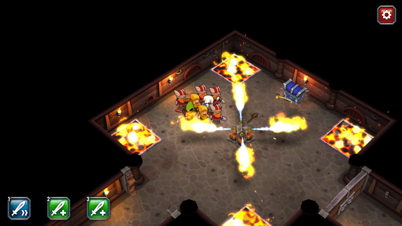 El control de Super Dungeon Run es extremadamente sencillo y aquí se encuentra una de las primeras particularidades del juego. Nos basta señalar un punto del mapa y, con el botón izquierdo del ratón pulsado, el grupo se desplaza a ese lugar. Puedes abrir cofres o atacar enemigos cercanos con un click, y la verdadera dificultad se encuentra por un lado en evitar recibir daños severos que causen bajas y por otro explorar el mapa para obtener todas las monedas posibles antes de pasar a un piso teóricamente más difícil.