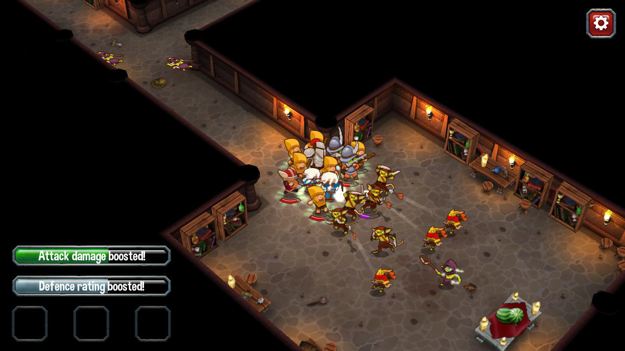 A lo largo del recorrido encontraremos nuevos compañeros, rehenes y puertas bloqueadas, algo que impide que se pueda superar de un tirón correteando por el escenario –la extensión de cada piso no es muy grande, en menos de 5 minutos se terminan-. Hay puertas metálicas que se desbloquean con un interruptor y otras mágicas que necesitan derrotar previamente a un monstruo –y no se indica cual-. Obtener botín es la razón principal para explorar estas catacumbas y gracias a ello podrás sumar unidades con nuevas habilidades: arqueros, guerreros, caballeros, brujos... También las unidades suben de nivel, pero es un sistema automático y poco transparente en el que no participamos, a diferencia de las mejoras del grupo donde sí se selecciona el aspecto a fortalecer –aumentar el número de integrantes, por ejemplo-.
