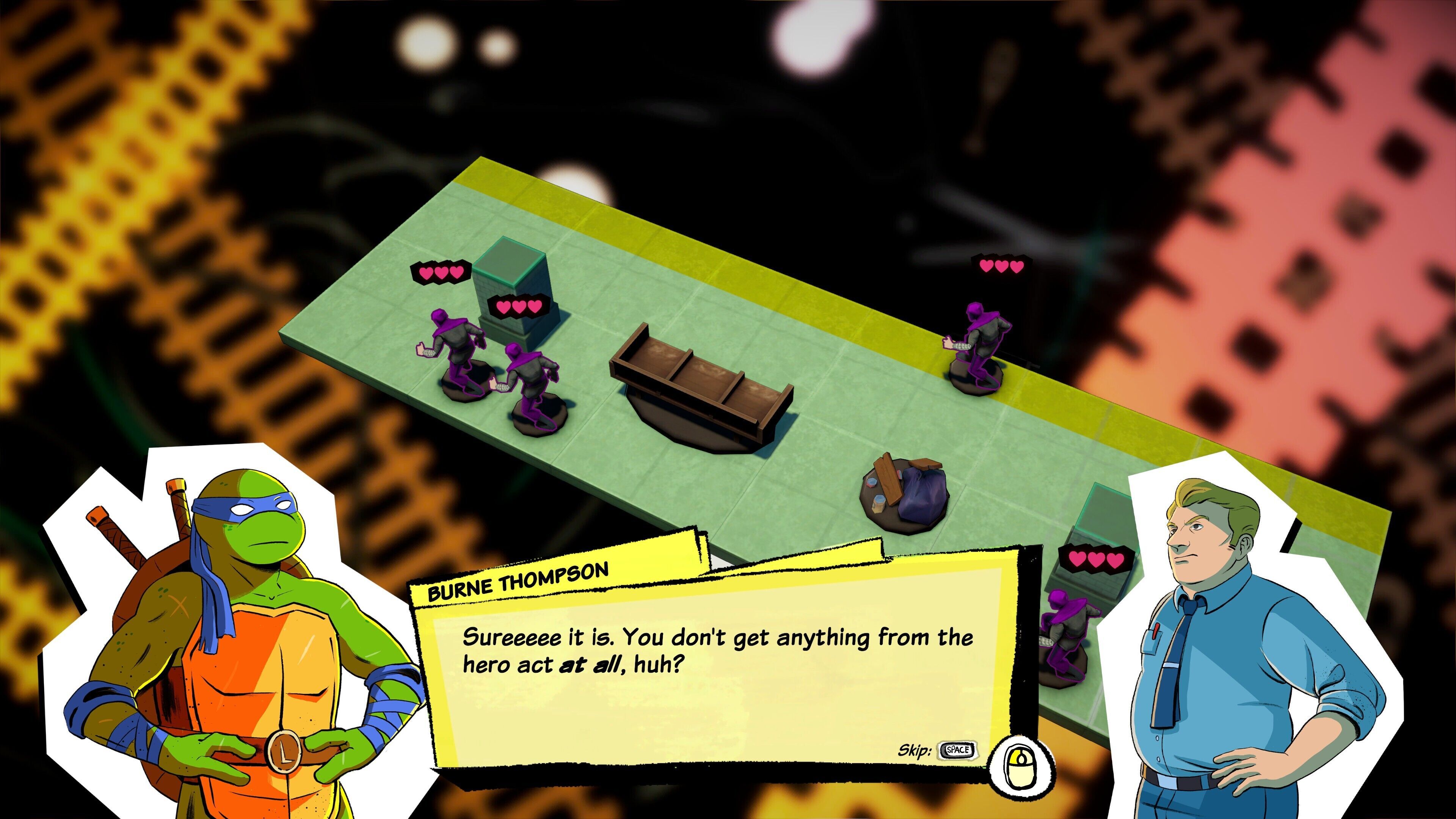 En cuanto al juego como tal, esta demo nos permite jugar el primer capítulo al completo, el cual se compone del tutorial y de cuatro misiones, cada una de ellas protagonizada por una tortuga distinta. Si esto último os ha sonado raro, es algo perfectamente comprensible, ya que lo normal es pensar que un juego táctico de las Tortugas Ninja debería proponernos peleas estratégicas en las que debemos controlar a los cuatro hermanos a la vez, buscando las mejores sinergias entre sus acciones para controlar el campo de batalla y abrirnos camino. A fin de cuentas, la serie siempre ha ido sobre eso, sobre cómo juntos son más fuertes, suplen sus carencias y pueden hacer frente a cualquier desafío que se les presente.