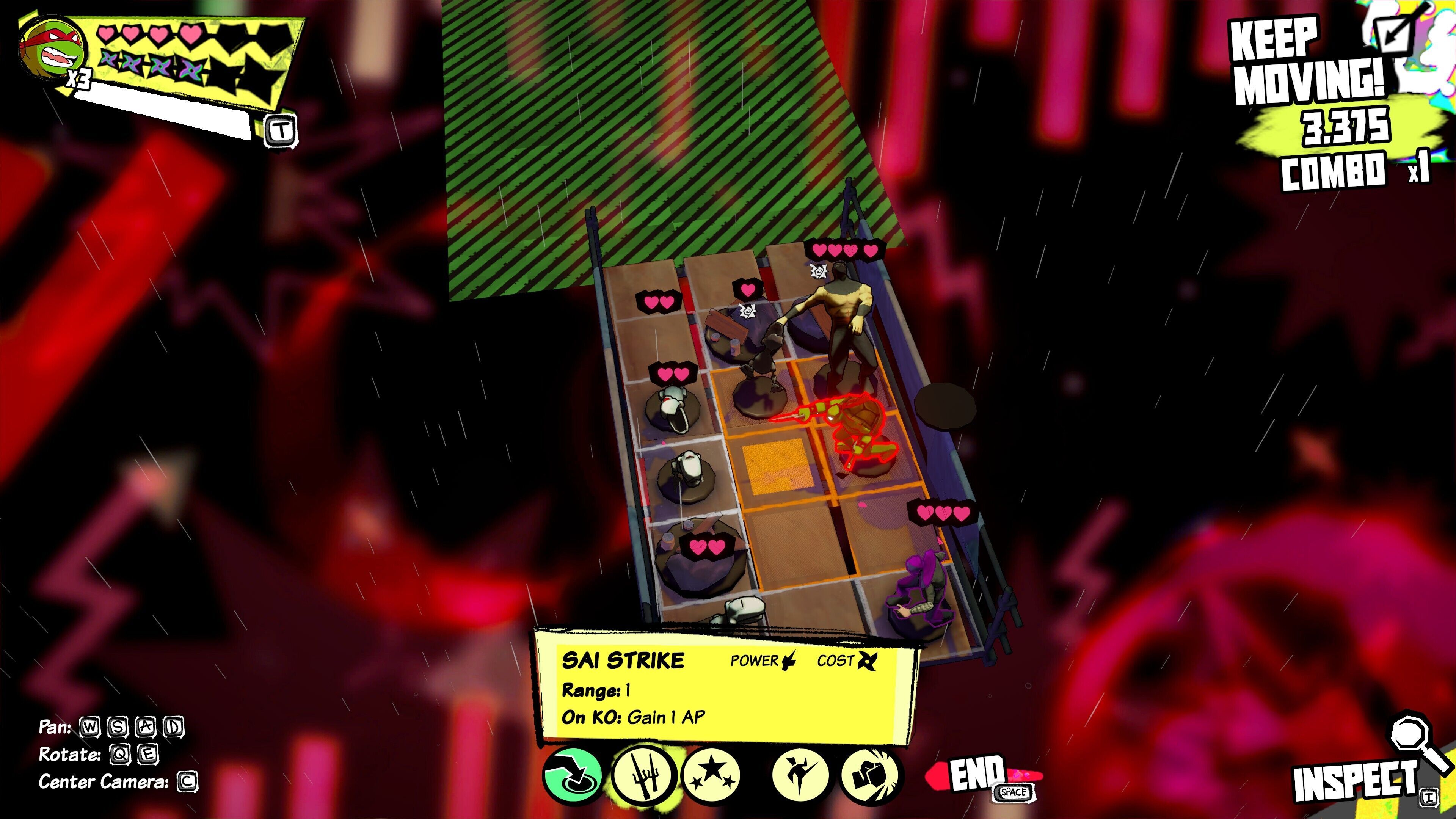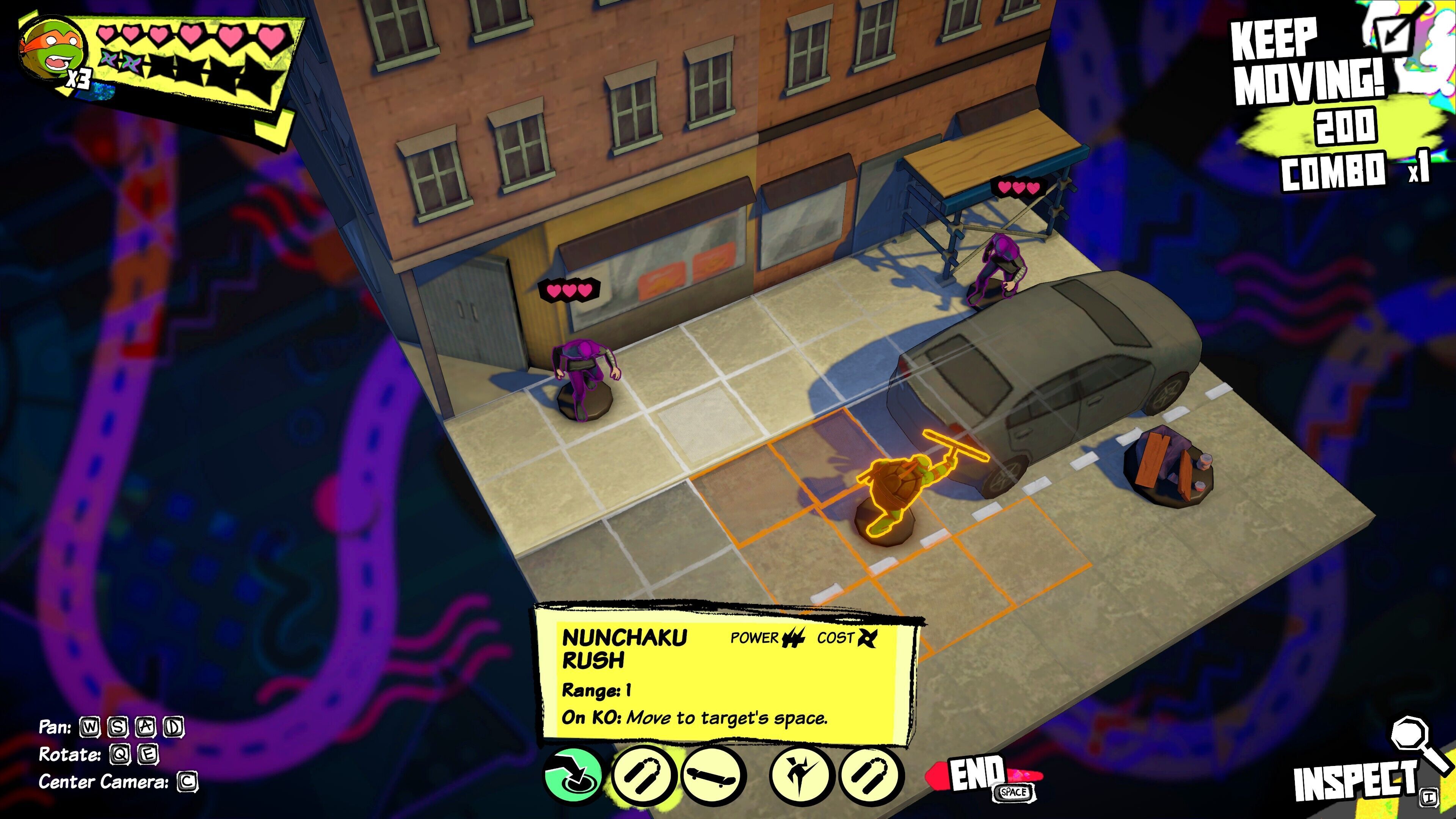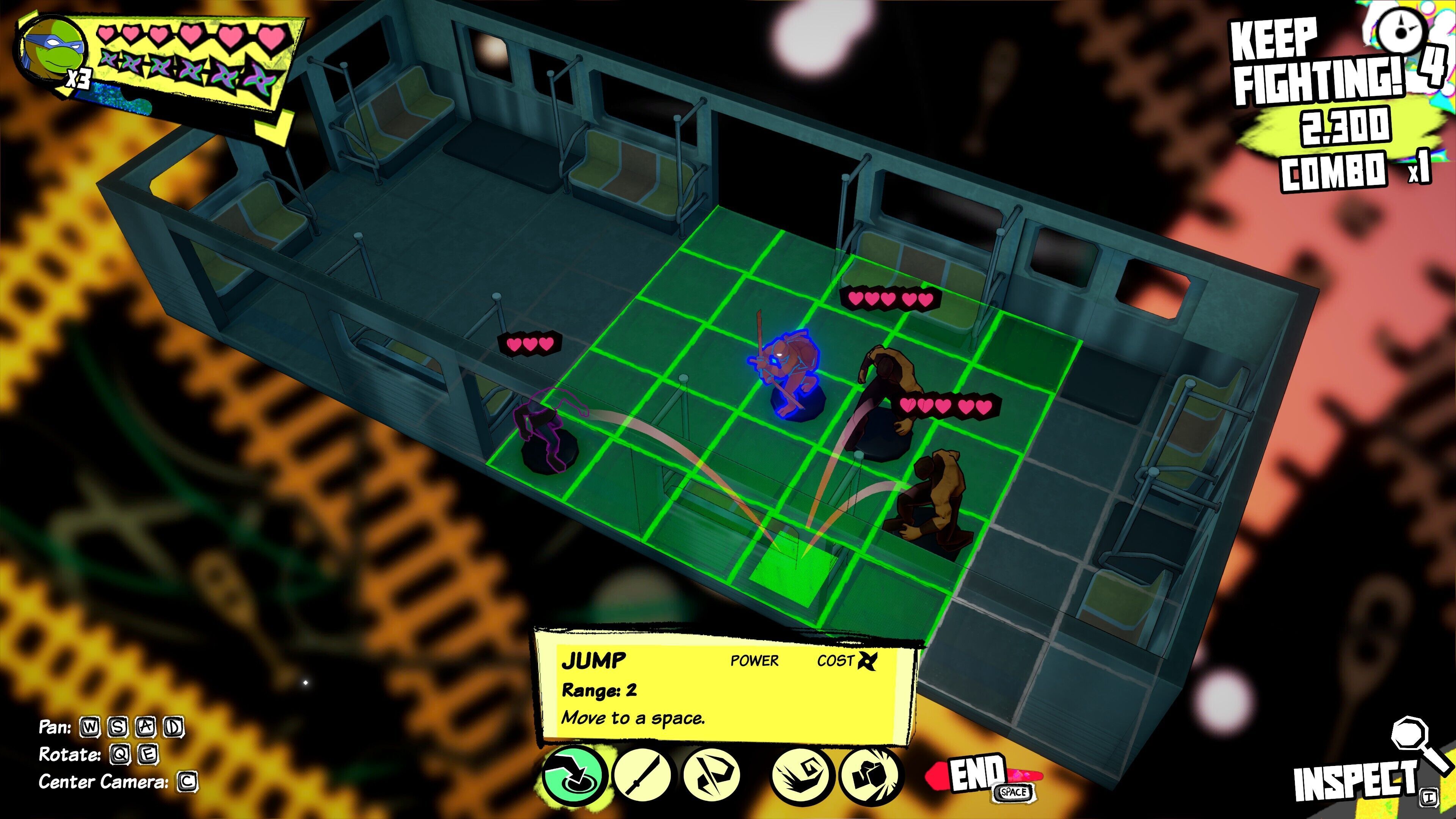 Así pues, a los mandos de la tortuga que nos toque controlar en cada ocasión, deberemos abrirnos camino por unos tableros divididos en cuadrículas en los que van apareciendo enemigos cada turno. Durante nuestra fase de ataque, tenemos un total de seis puntos de acción que podemos usar tanto para movernos como para poner en práctica alguna de las técnicas de nuestros protagonistas, por lo que siempre deberemos buscar la mejor forma posible de utilizar nuestras habilidades para poder liquidar el mayor número de enemigos que podamos a la vez que buscamos una posición segura que nos evite sufrir daños cuando le llegue el turno a nuestros rivales.