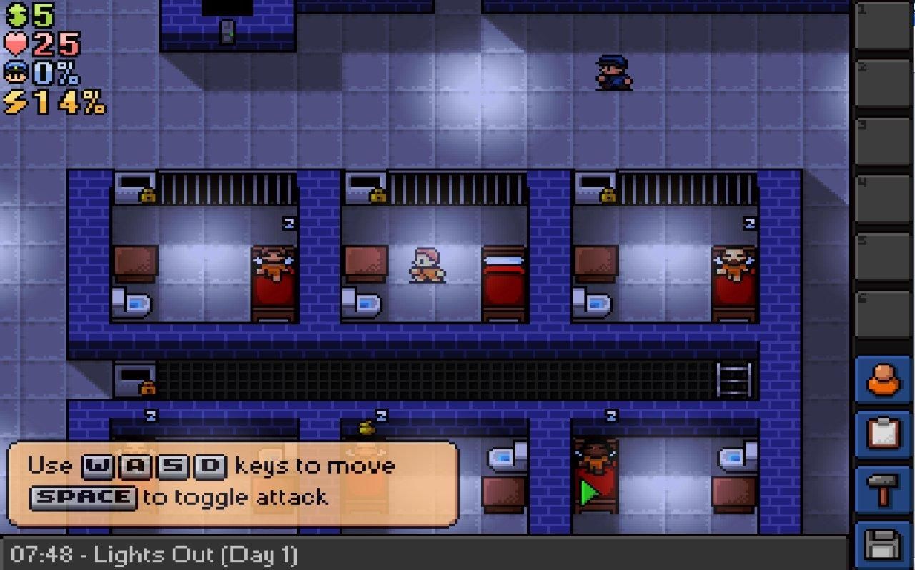 Gráficamente, como podéis ver por las imágenes que acompañan a este artículo, se trata de un juego indie que hace uso de un aspecto gráfico retro en pixel art (sí, otro más, y con este van...), por lo que no os esperéis nada realmente atractivo, ya que los presos si no tuvieran sus nombres sobre sus cabezas no los distinguiríamos bien y los guardias son todos iguales.