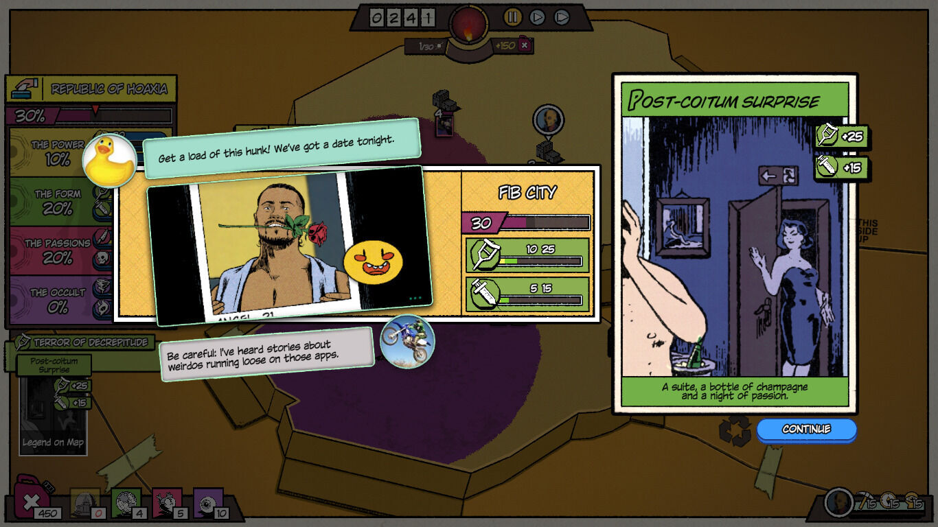 A nivel jugable, podríamos entender The Fabulous Fear Machine prácticamente como la adaptación virtual de un juego de mesa tradicional que no existe. Tenemos un mapa con varias ciudades que representan lugares reales del mundo; primero implantamos la semilla del miedo (literalmente) cerca de una población, y a partir de ahí podemos mandar a nuestros agentes de campo para que exploren la zona y difundan bulos que nos ayuden a meter miedo a la sociedad. Como podéis ver, el juego de Fictiorama Studios representa desde una ficción muy atractiva los problemas de desinformación que afectan a la sociedad actual.