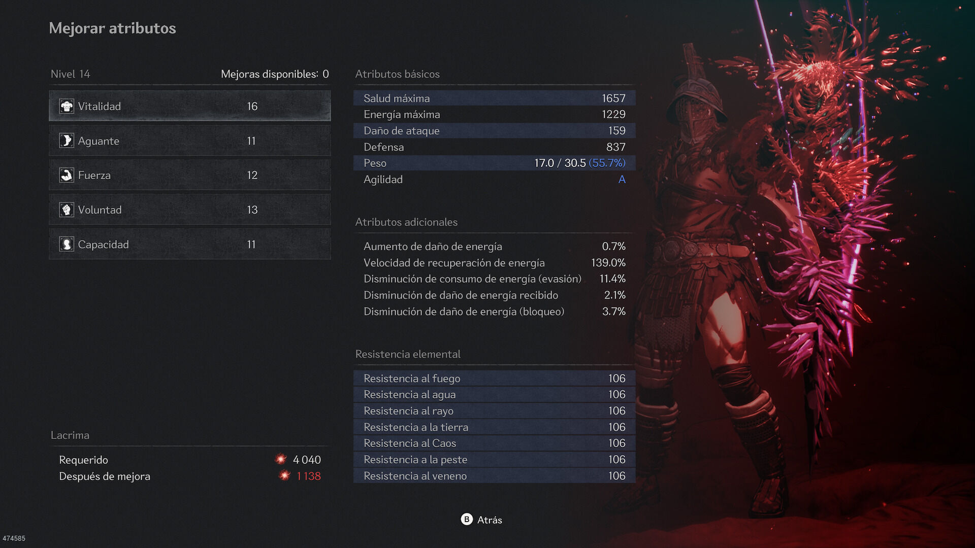 La estrategia combativa es, por tanto, más importante de lo que parece, algo que sale a relucir en los jefes. En esta demo pudimos enfrentarnos a un par de ellos, y nos resultaron de lo más estimulantes. Es necesario comprender sus pautas de comportamiento, y a mitad de la refriega pueden variar para darnos un plus de desafío. ¿Lo mejor? Que este juego no te castiga demasiado, y aunque fracases en cada intento puedes ganar experiencia. Un orbe de energía -lacrima- te está esperando en el mismo sitio en que perdiste la vida, algo que facilita que vayas mejorando tus habilidades y estadísticas (salud, energía ataque, defensa, agilidad…) para que tu siguiente intento tenga mayor éxito. Es algo que funciona fenomenal.