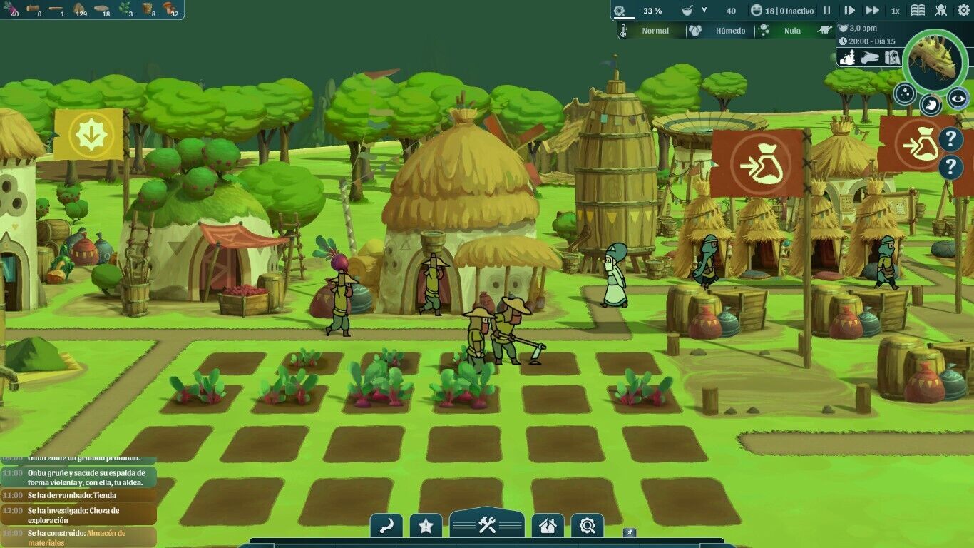 Este aspecto, los avisos y notificaciones de lo que ocurre en la aldea, también necesita ser revisado a lo largo de este proceso de desarrollo en abierto: actualmente las acciones tanto de los aldeanos como del Onbu apenas se registran en un pequeño chat que vemos abajo a la izquierda de la pantalla. Cuando hay una hambruna y los aldeanos van muriendo, The Wandering Village no nos avisa de que el contador baja y de buenas a primeras podemos encontrarnos con una población diezmada que significa el final de la partida. Recibir ese tipo de información de forma clara y llamativa es esencial en un juego con interfaces tan abarrotadas como este, algo que de momento no consigue.