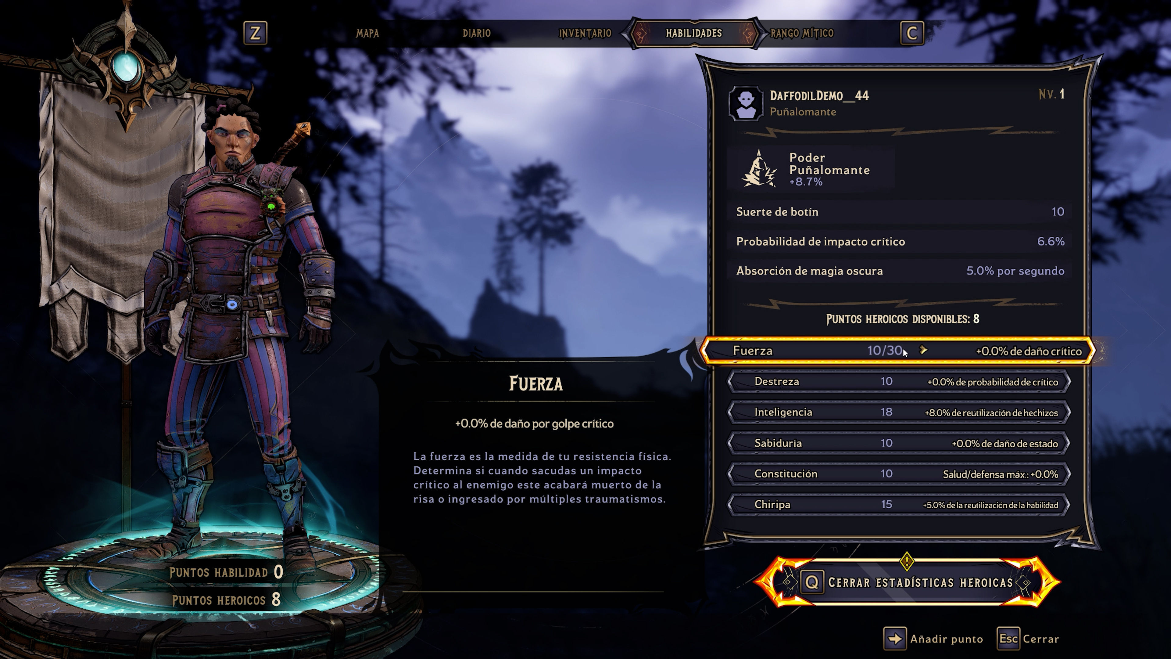 La primera ya venía con los puntos de habilidad asignados y se trataba de una maga oscura que nos permitía jugar con sus puntos de salud para o bien realizar una poderosa magia en área, o bien para obtener invulnerabilidad momentáneamente; cada clase cuenta con una habilidad única. Además, estaba acompañada por su semiliche, una mascota que no se callaba ni debajo del agua y que lanzaba hechizos por su cuenta a los enemigos. Si con la Sepolcronato buscábamos siempre las distancias, con el Puñalomante, al menos tal y como lo personalizamos, era justo lo contrario. Al potenciar los golpes críticos en el cuerpo a cuerpo, intentamos comenzar la batalla con estocadas e invocar su demoledor cuchillo giratorio mágico siempre que varios enemigos se arremolinaban en un punto.