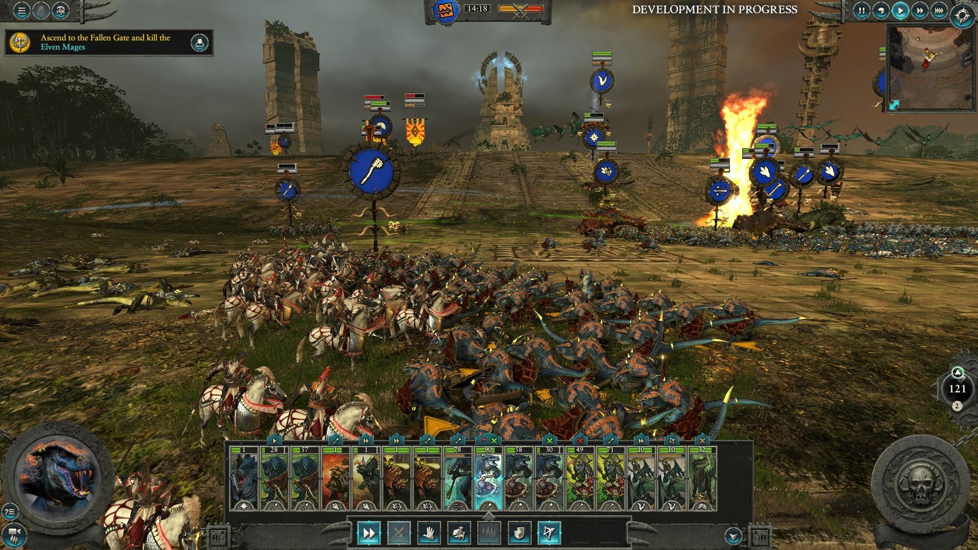 Como podéis imaginar con una secuela que se lanza apenas un año después del original, aparentemente no hay grandes novedades, ni jugables ni visuales, pero las diferentes facciones y su enorme cantidad de peculiaridades ya hacen que sientas que estás jugando a algo nuevo. Los agresivos Hombres Lagarto, con sus espectaculares unidades de dinosaurios, te invitan a lanzarte a por el enemigo sin miramientos. Pero precisamente los Altos Elfos son grandes defensores, y el combate estuvo muy igualado hasta el final.