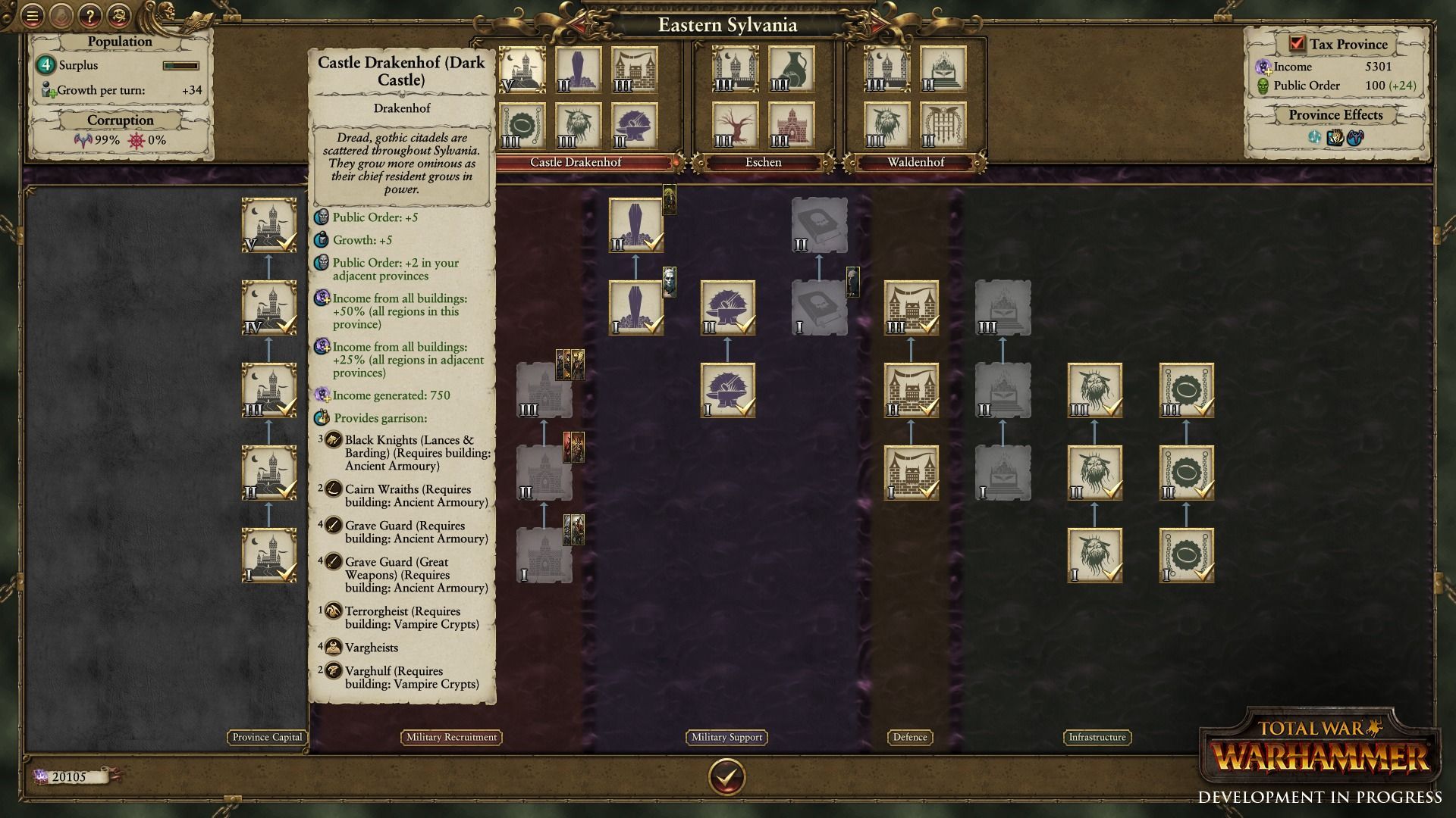 Allí dónde estén se creará una atmósfera oscura que cambiará el aspecto de las provincias cercanas y fortalecerá los ejércitos de No Muertos, debilitando a su vez a las demás razas. Del mismo modo, si se encuentran en tierras no corrompidas, tanto ellos como sus tropas se debilitarán con cada turno que pase (como ocurría en los anteriores Total War con las condiciones meteorológicas). La Corrupción Vampírica también tendrá un efecto desestabilizador en los pueblos cercanos, reduciendo el orden público y desencadenando rebeliones vampíricas que nos serán muy útiles para garantizar nuestra expansión.