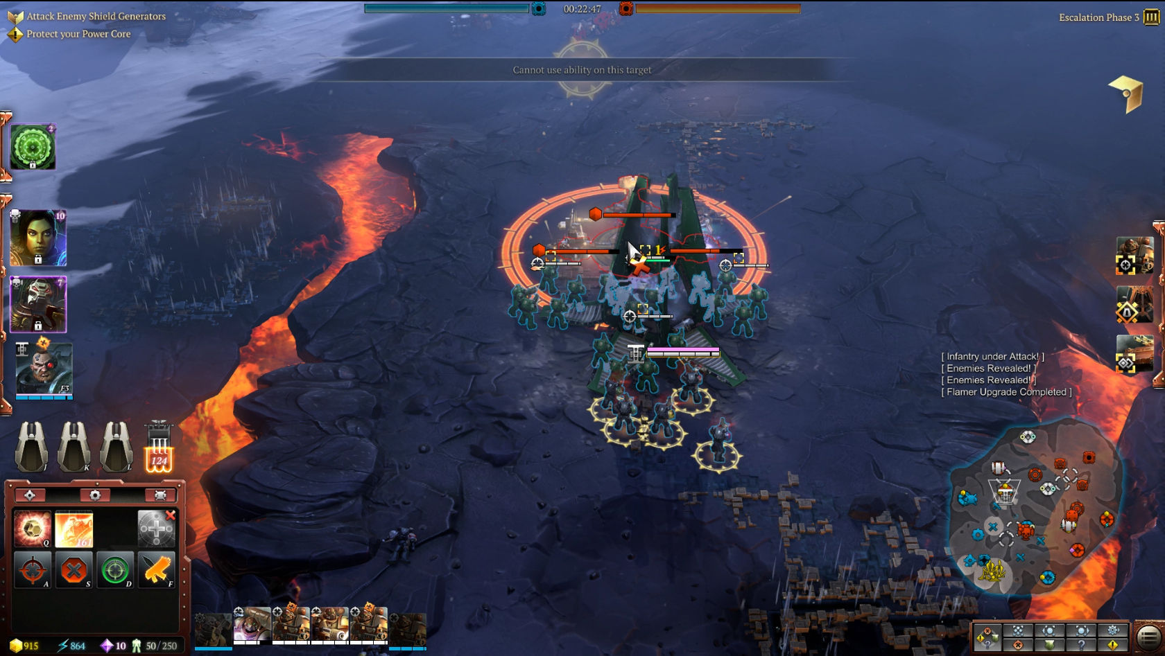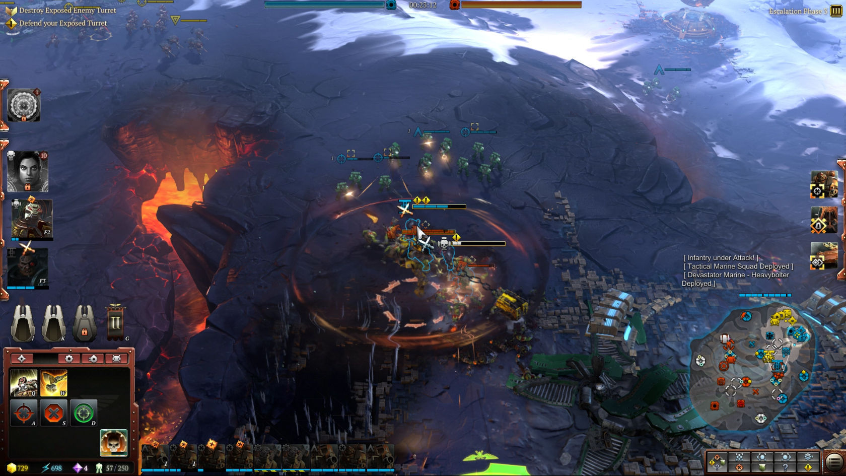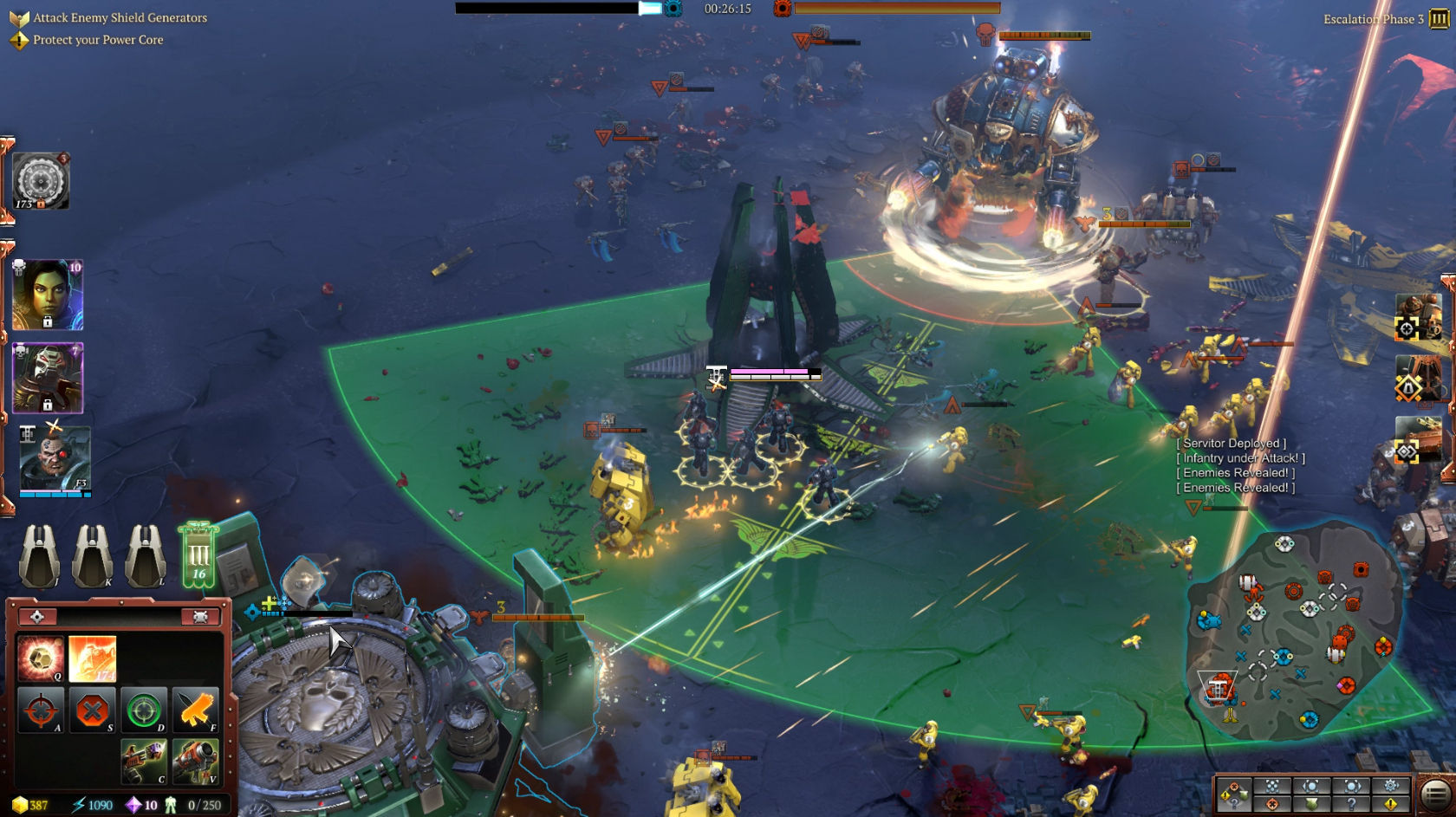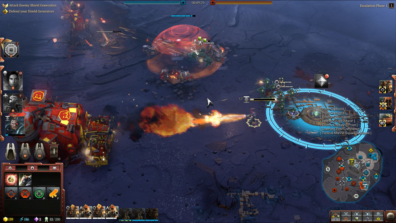 En la demo que jugamos había cinco líderes disponibles de cada facción, aunque en la versión final habrá más. Es importante decidir qué tres líderes eliges para cada partida. Cada uno de ellos consume unos puntos de liderazgo, en función de su potencia y sus habilidades especiales. Por ejemplo, el bibliotecario Jonah Orion consume 3 puntos de líder (los mismos que la eldar Farseer Macha), mientras que un exterminador utiliza 7 y hacen falta 10 puntos de líder para unir a tu ejército a Solaria.