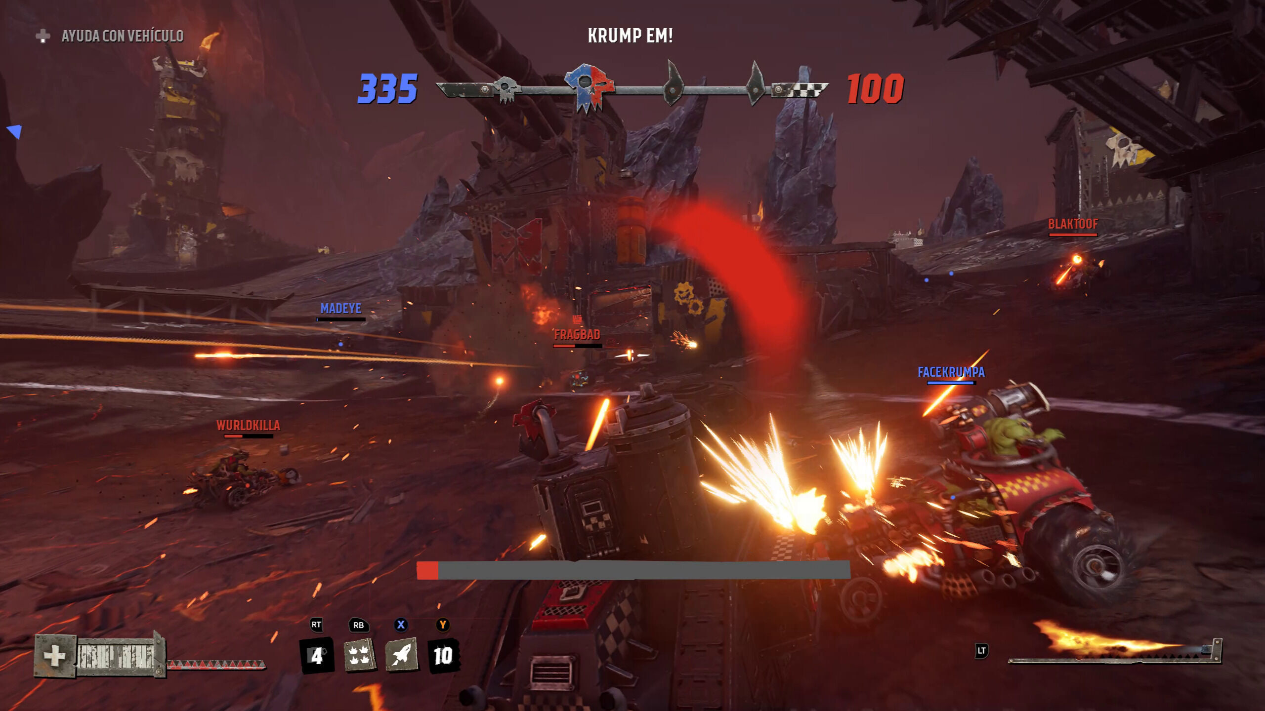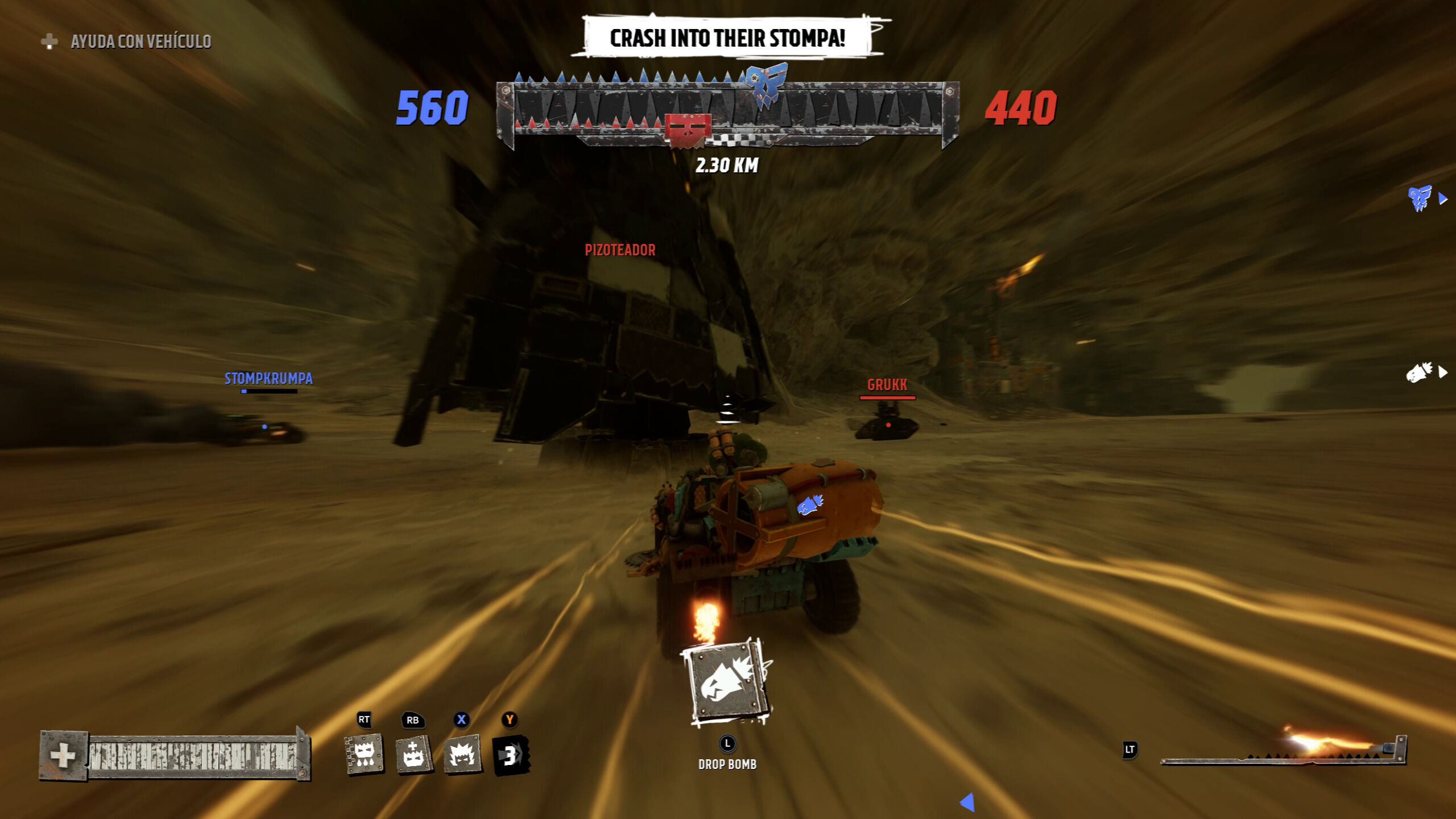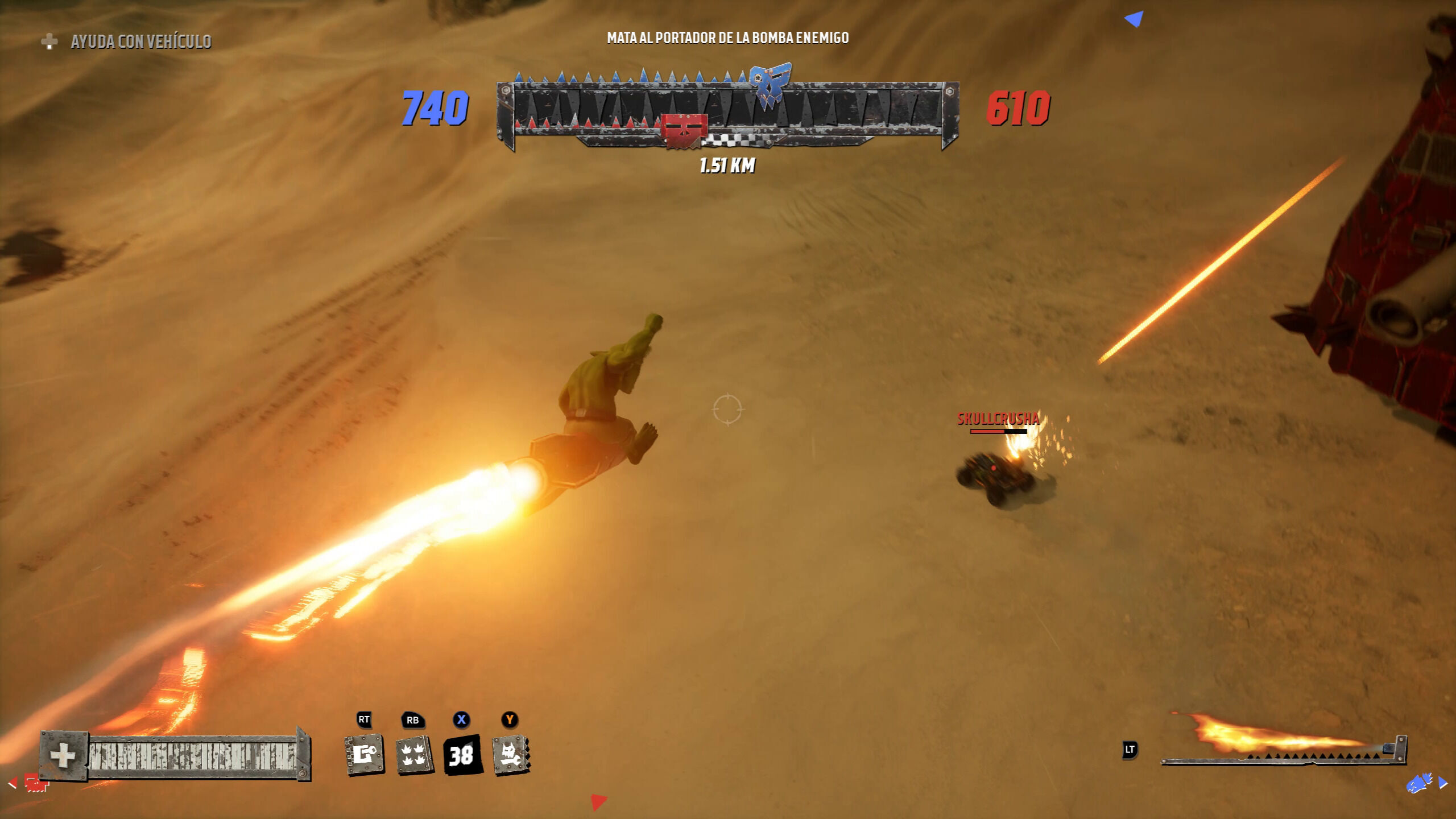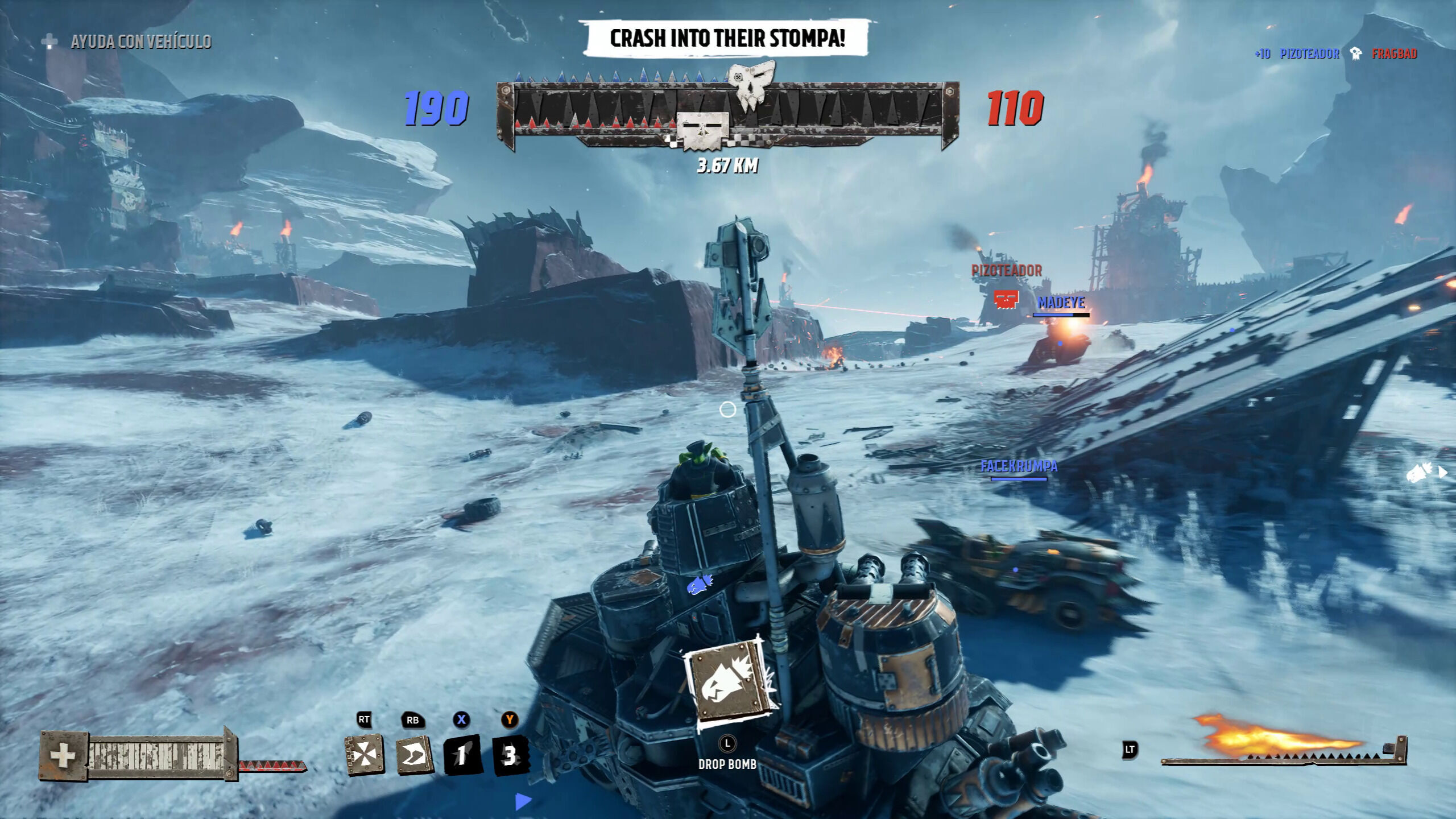 En el modo de las Apizonadoras sí se generan más situaciones interesantes, aunque las partidas se hacen largas. El objetivo aquí es sumar más puntos que el equipo rival antes de que acabe el tiempo. Esos puntos no se obtienen al matar a los rivales, sino recogiendo las bombas que aparecen en el amplio mapa y después chocándonos contra la Apiszonadora rival. Es mucho más fácil decirlo que hacerlo, claro. Aquí se dan momentos intensos con más asiduidad: la carrera hacia la bomba, hacia la que también irán los rivales; huir con ella mientras un montón de vehículos enemigos nos persiguen y pudiendo soltarla para que la recoja un compañero; y por supuesto, tratar de acercarnos a esa Apizonadora, probablemente defendida por otros enemigos, y que también nos dispara y nos eleva por los aires.