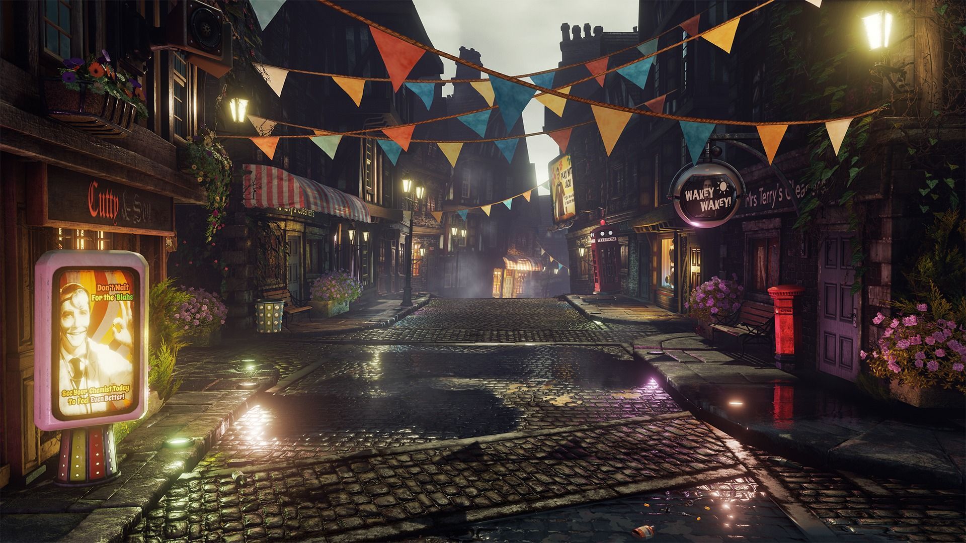 En este año, We Happy Few también ha mejorado notablemente en lo audiovisual. Artísticamente, sigue siendo apabullante, con una estética que nos encanta, y verlo ganar complejidad y detalle sólo hace que destaque todavía más. Como podéis esperar, las ciudades ahora están más vivas y cuidadas. Hay más que ver, más que explorar. De hecho, incluso nos ha sorprendido que ya cuenta con una optimización bastante decente para estar en fase alfa.