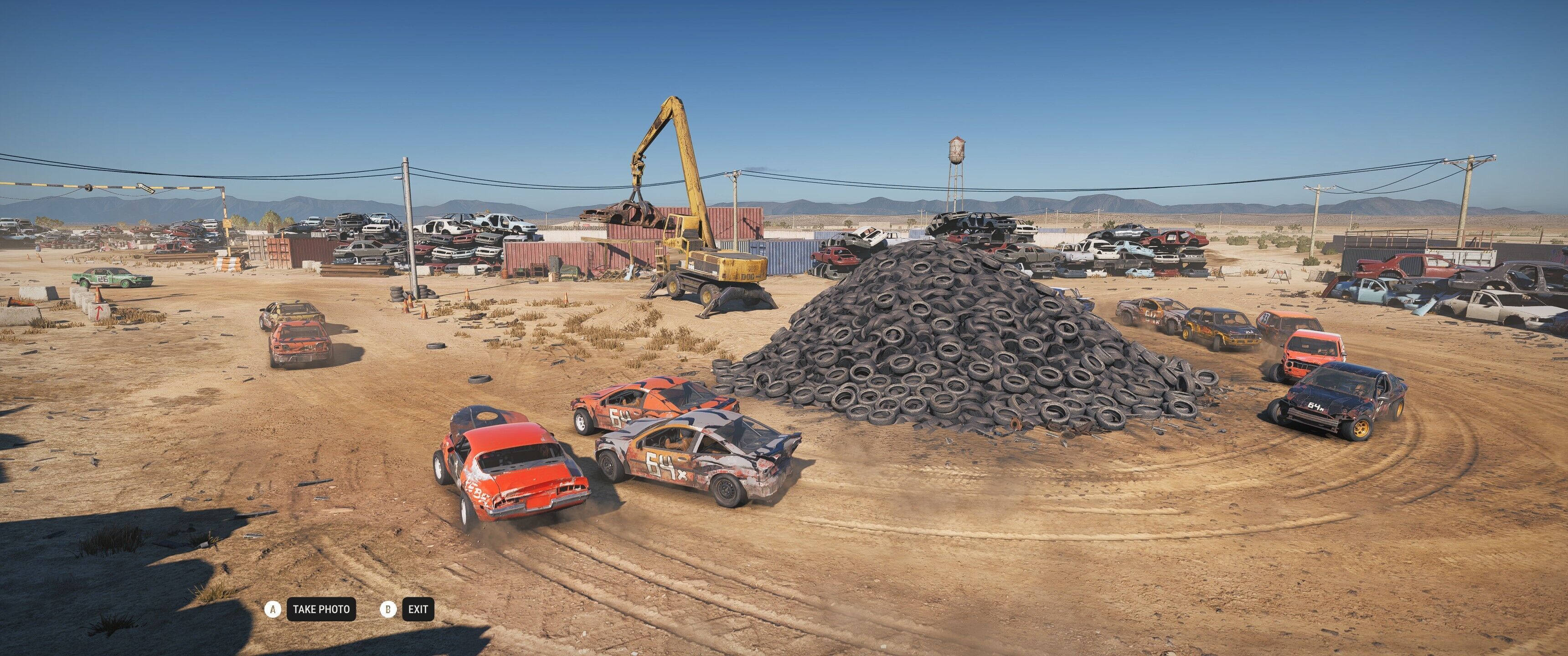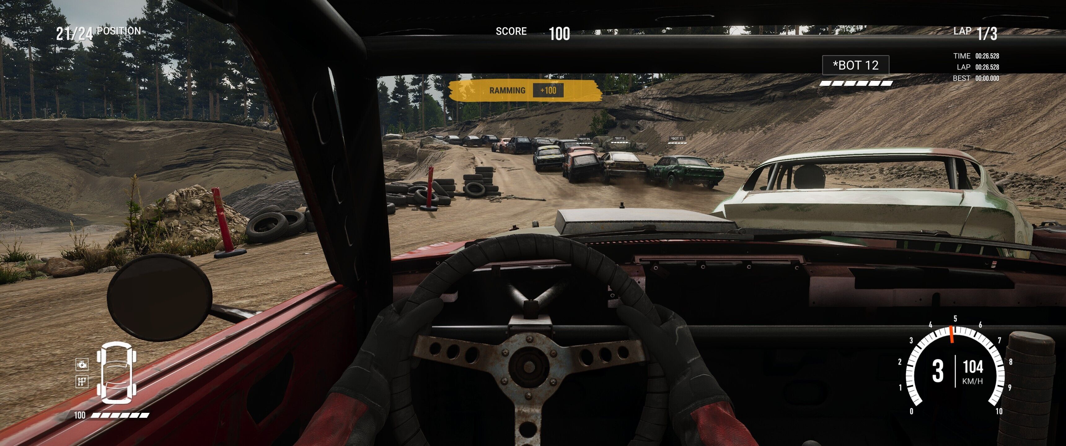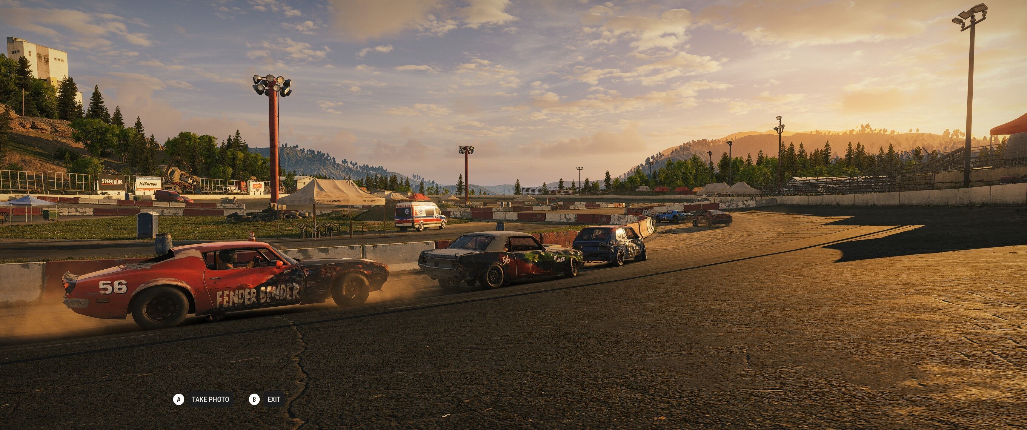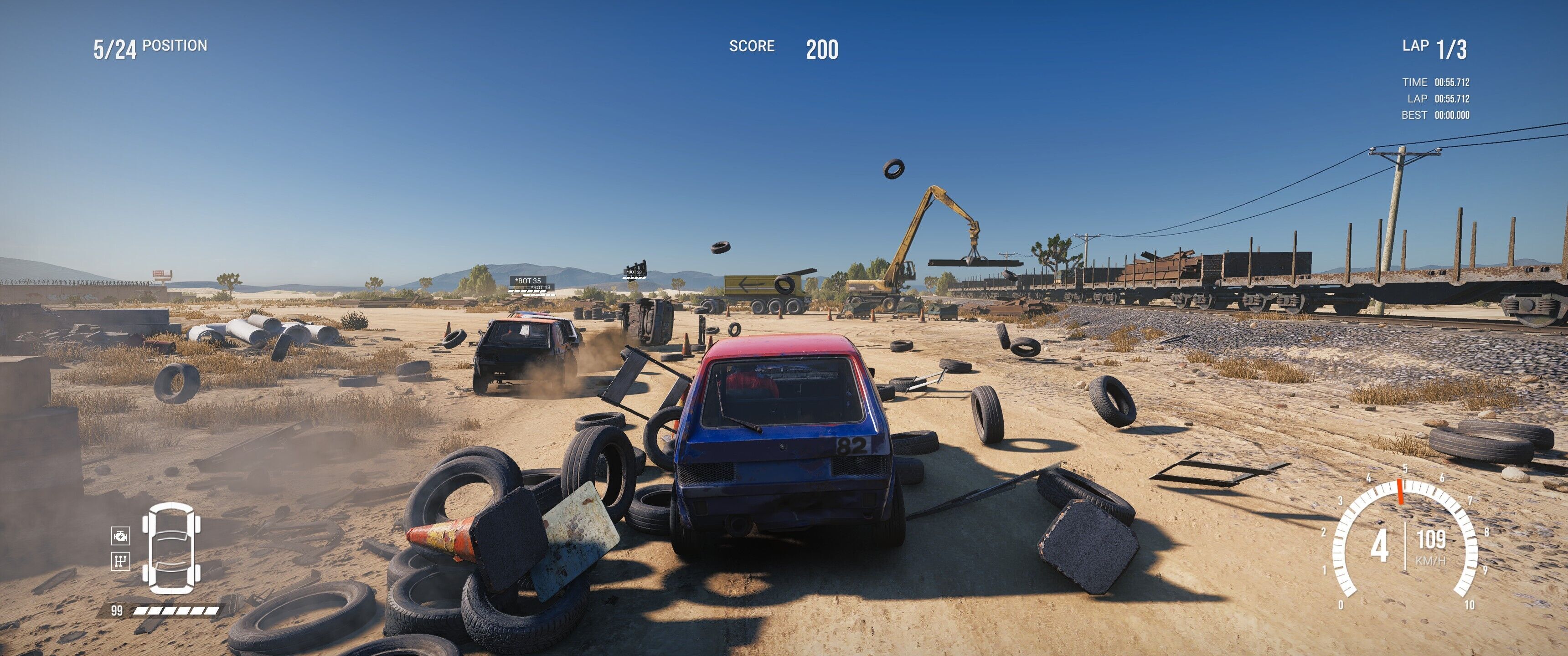 Gráficamente, Wreckfest 2 representa un salto significativo respecto a su predecesor. Puede no parecerlo a primera vista, pero los entornos exteriores son más detallados y elaborados, y los coches son mucho más complejos y, como decíamos, se rompen y se deforman con mayor complejidad. Además, está relativamente bien optimizado para acabar de salir en acceso anticipado, y aunque faltan cosillas –no tiene ninguna herramienta de reconstrucción de imagen, por ejemplo–, ha sido relativamente fácil jugar a 60 imágenes por segundo a 1440p con casi todo en alto en un ordenador un tanto viejete. Eso sí, es un juego en el que pueden chocar en una misma esquina 24 coches que se destrozan mutuamente mientras decenas de neumáticos colocados a modo de barrera en el circuito vuelan por los aires y, obviamente, la tasa de imágenes por segundo puede sufrir.