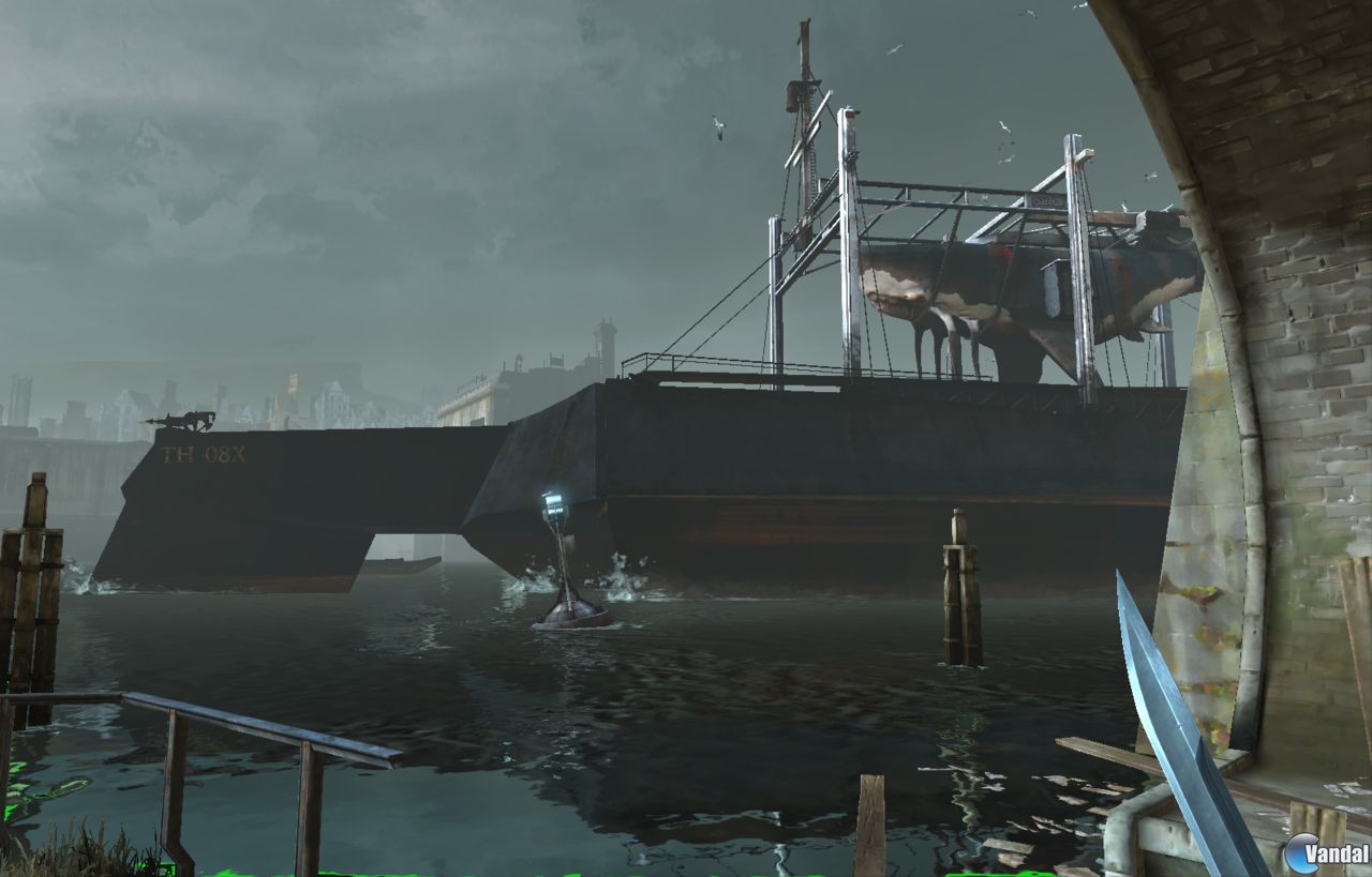 Prácticamente deshacemos el camino recorrido, volviendo al lugar del comienzo de la demo en el muelle. Aquí nos sale un nuevo enemigo, una especie de mecha o robot rudimentario de largas patas, y no podemos evitar acordarnos de ciertos enemigos de Half Life 2, no puede ser casualidad que Viktor Antonov ande detrás del diseño de ambos. Congelando el tiempo y con un enorme salto, de un par de cuchillazos acabamos con una de estas máquinas, desplomándose en el suelo con una gran animación. También nos fijamos en lo hermosa que se ve el agua desde lejos, en la que brilla la luz, son un montón de detalles de gran calidad que cuestan digerir en una corta demo. Finalmente volvemos a la cloaca del inicio, en la que siguen los maderos rotos exactamente igual que los dejamos.