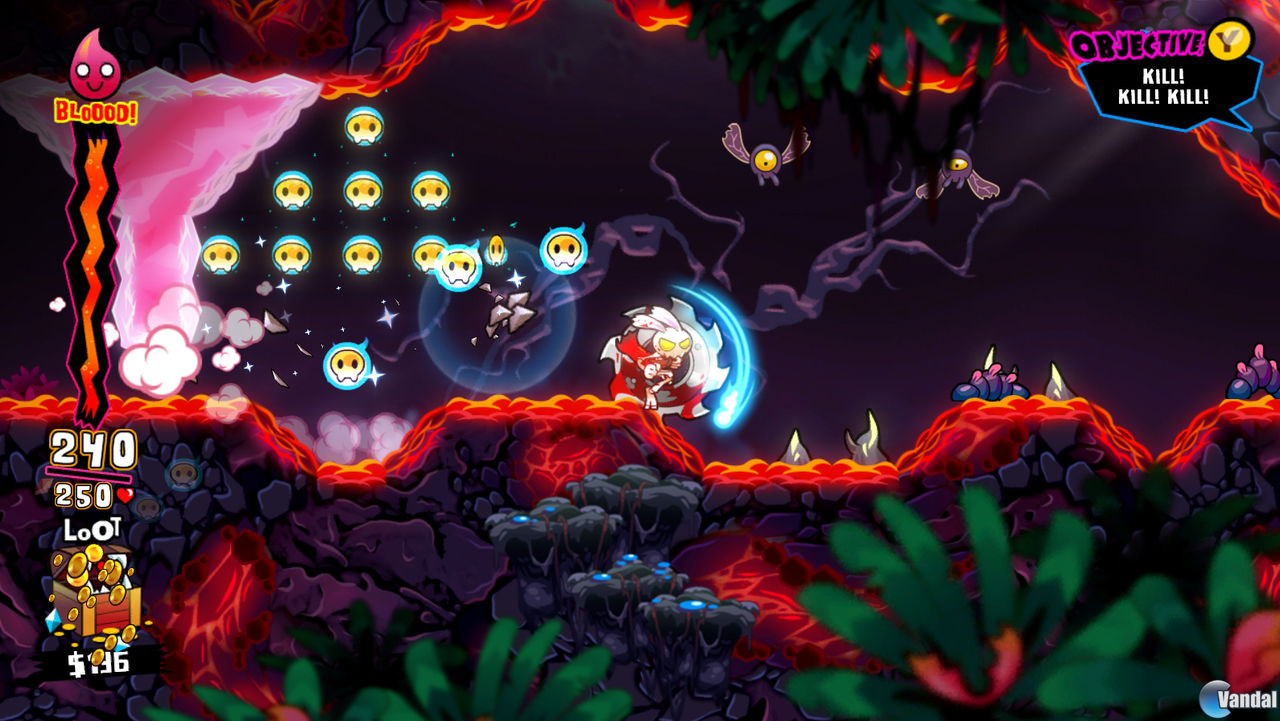 Lanzando una inofensiva flecha de cupido que se acaba convirtiendo en un mar de flechas que aniquilan al enemigo, una bomba que sube a lo alto del escenario y cae con toda su rabia reventando al adversario, o simplemente con la cuchilla haciéndole picadillo en mil trozos, en forma de jamón, que impactan en la pantalla. Gráficamente es genial, muy llamativo, con un estilo gráfico mezcla de cartoon norteamericano con animación japonesa, pero que consigue su propia y potente personalidad, y el aspecto de dibujos animados consigue eludir ese estigma en el que caen muchos juegos descargables, que parecen hechos con Adobe Flash. Uno de los títulos 2D no poligonales más atractivos que vamos a poder encontrar en cualquier plataforma de descarga digital.