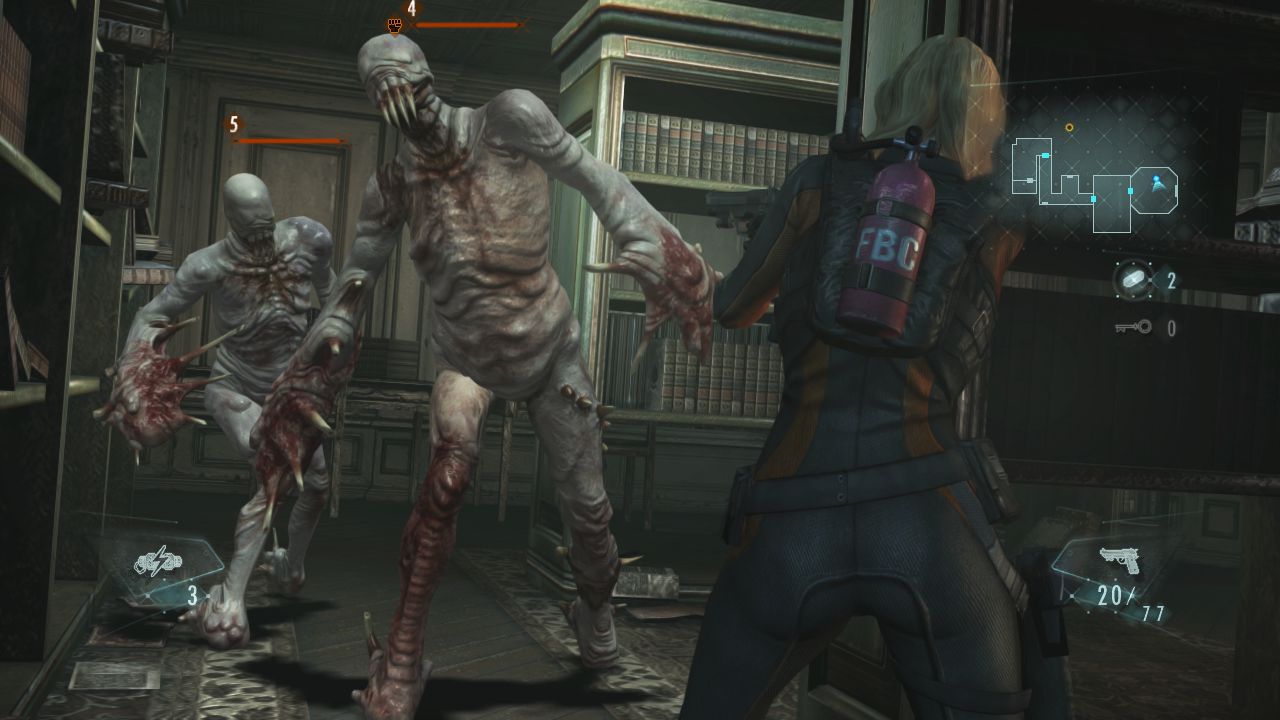 Lo que en 3DS nos parecieron unas escenas de acción no demasiado brillantes, debido al reducido tamaño de los escenarios, y a unos enemigos de los más desafortunados de la saga –unas masas de carne blanca sin ningún carisma-, en sobremesa queda todavía más en evidencia. Lo bueno es que no tenemos algunas de las limitaciones de los controles de 3DS que se subsanaban con un accesorio -el Botón Deslizante Pro-, y aquí podemos movernos y disparar sin problemas con el mando, algo que han tenido en cuenta haciendo a los enemigos un poco más rápidos y agresivos. La munición escasea mucho más que en las últimas entregas principales de la saga, lo que nos obliga a usar el bioescaner Genesis, una herramienta que sirve para explorar los escenarios desde una perspectiva en primera persona, encontrando objetos y escaneando a los enemigos, lo que nos premia con hierbas verdes para recuperar salud, algo que le da un toque variedad al desarrollo.