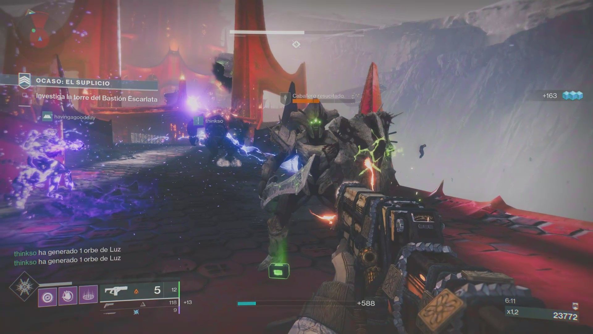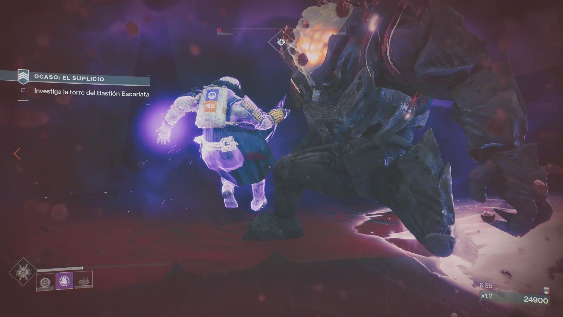 El ocaso que jugamos en la presentación, El suplicio, era un asalto al Bastión Escarlata: una subida hacia la cima de esa gran torre donde había todo tipo de mecánicas. Comenzábamos enfrentándonos contra hordas de la Colmena y capturando portales, continuamos hasta una zona donde teníamos que derrotar magas para recoger varios orbes que bajarían un puente, había caminos que nos obligaban a usar con precisión nuestros saltos, y un ascensor que apenas nos dejaba respirar – nos atacaban enemigos conforme subíamos, y parábamos cada poco para derrotar a grandes ogros para poder continuar el ascenso.