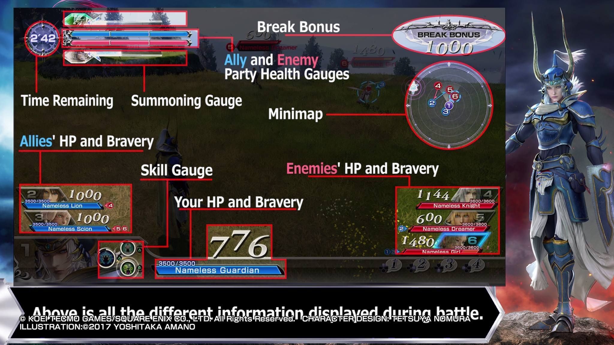 Tanta información a tener en cuenta provoca una de las interfaces más confusas que hemos visto en los últimos años. Es cierto que toda la información que necesitas está ahí, con el minimapa, la salud de todos los participantes, el tiempo restante… Pero el diseño es, durante nuestra primera toma de contacto, demasiado recargado. Sin duda va a intimidar a quien se acerque a Dissidia por primera vez, e incluso a algunos veteranos.